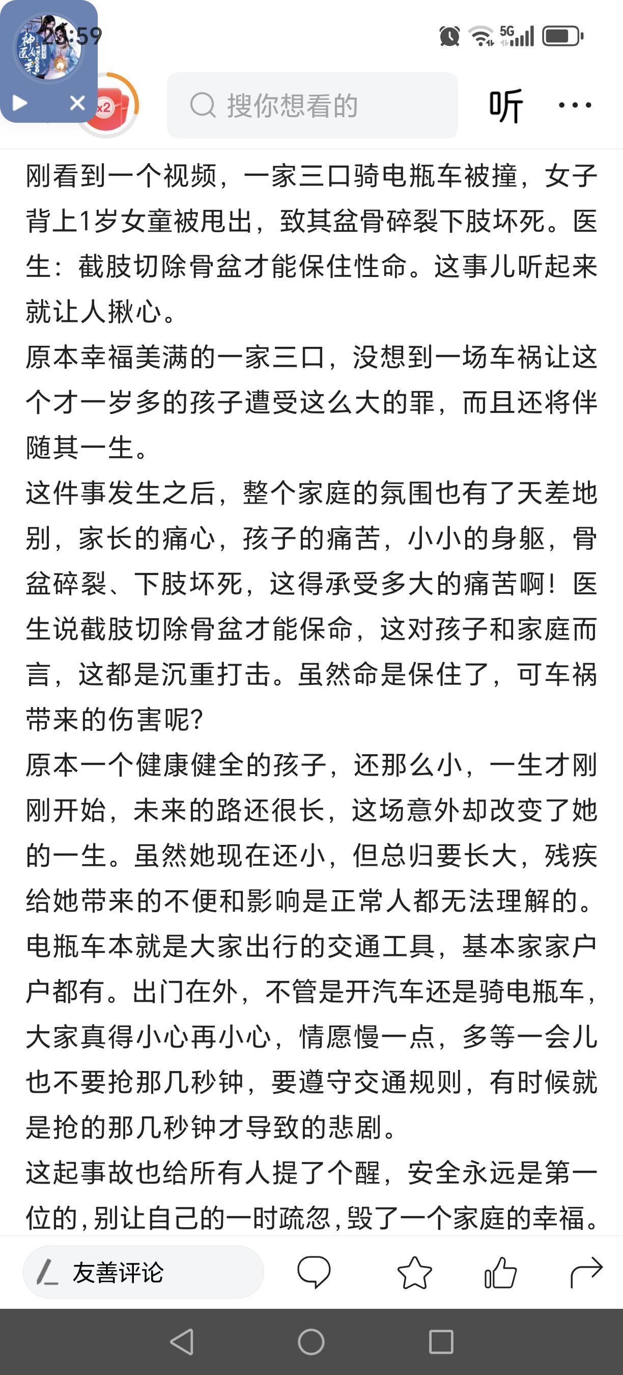 刚刚写的一篇短文,一家三口骑电动车,一岁多的女童在妈妈背后被车撞后甩出,致其骨盆碎裂下肢坏死。医生:截肢切除骨盆才能保住性命。我就这件事发表自己的看法,结果却被头条判定为传播不良价值观,展现量低的可怜,连申诉的机会都没有。 我只是实话实说而已,大家可以看看我写的原文,一个原本健康健全的孩子,才一岁多遇上这种事情,落下终身残疾,以后对她的生活会带来很多不便,父母家人的心情也可想而知,怎么就被判定为传播不良价值观了? 怎么都想不通,友友们帮我看看,我的小作文哪里违规了?期待友友们提出宝贵的意见。