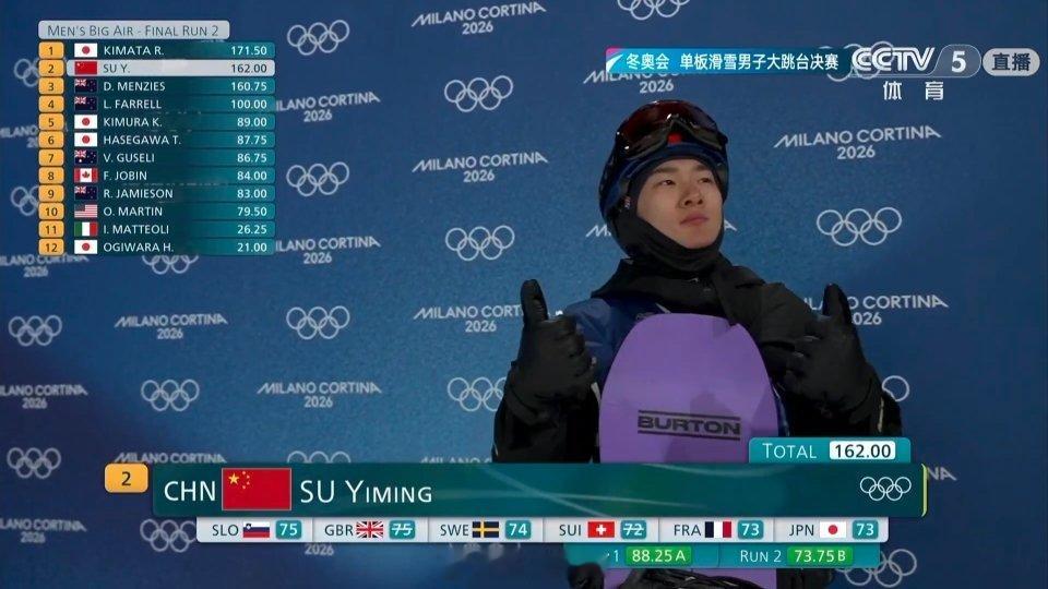 苏翊鸣决赛2026米兰冬奥会单板滑雪男子大跳台决赛第二跳苏翊鸣总分162.00