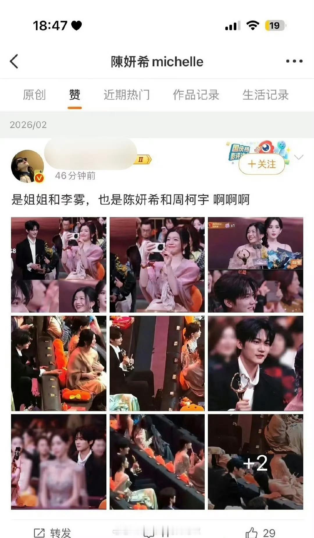 陈妍希又点赞了妙不柯妍相关,全是微博之夜和周柯宇的甜蜜互动瞬间。说实话明星本人多次点赞真人cp,观感真的有点 微博之夜