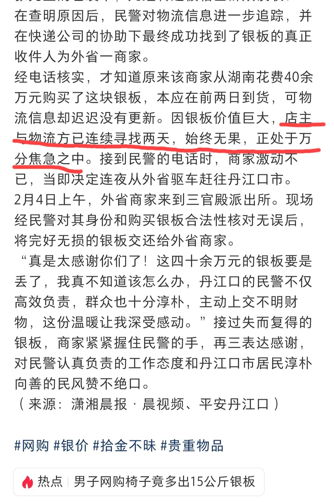 湖北一男子网购了一款椅子,不想却连带着收到了一块价值高达40万的银板。男子不假思索立马选择了报警,最终在警方的协助下将银板交还到了为找回失物急得焦头烂额的失主手中…… 评论区网友戏谑道:本来丢了快递公司会理赔的,现在好了,白银的价格也跌了快一半了,找回来了,我猜失主并不会特别感谢这人把这块银板给他退回来![捂脸][捂脸][捂脸] 更让人哭笑不得的是,网上晒出的这位好心人受表彰的照片,这位好心人站在两位jc中间,感觉不是被表彰或者感谢,好像是被jc抓住的犯人,好巧不巧,他当时穿的又是那种土了吧唧的睡衣,而这种睡衣是看守所里面嫌疑犯的标配![捂脸][捂脸][捂脸]