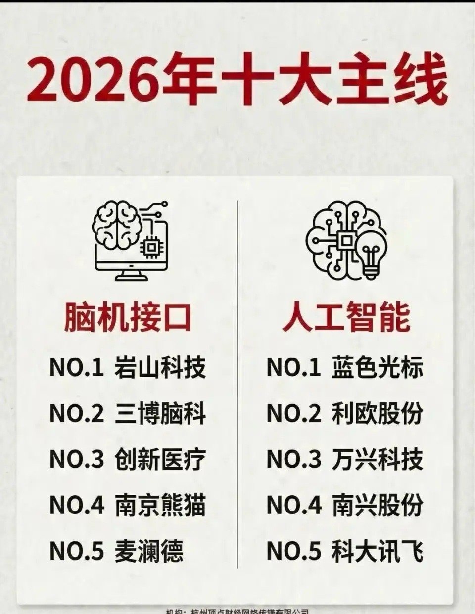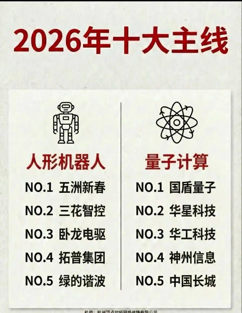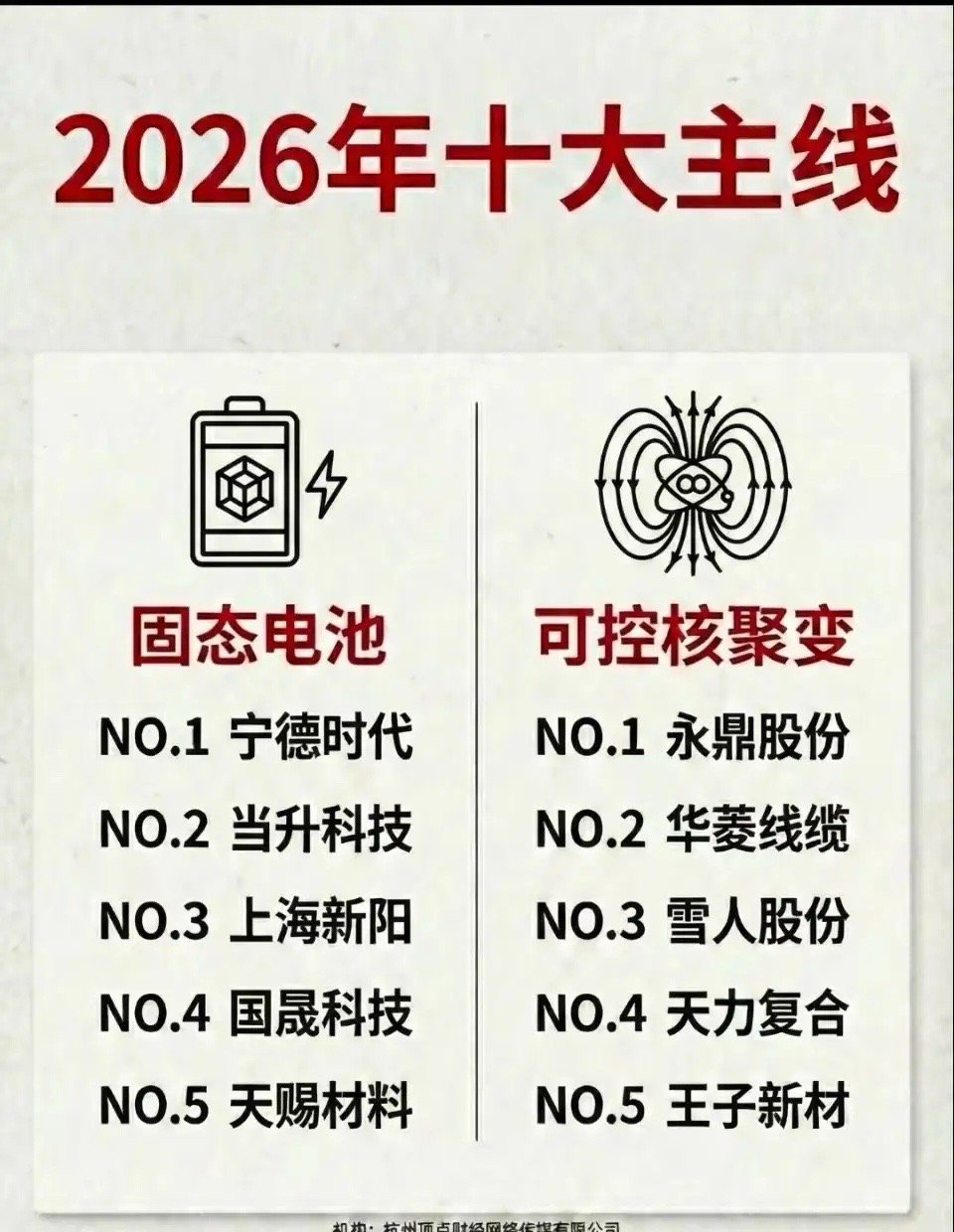 2026年A股十大主线梳理!1、商业航天:航天发展、神剑股份2、自动驾驶:浙江世宝、山子高科3、固态电池:宁德时代、天赐材料4、可控核聚变:永鼎股份、雪人集团5、脑机接口:岩山科技、三博脑科6、人工智能:蓝色光标、利欧股份7、人形机器人:五洲新春、三花智控8、量子科技:国盾量子、华工科技9、液冷:英维克、工业富联10、侧端:广和通、瑞芯微