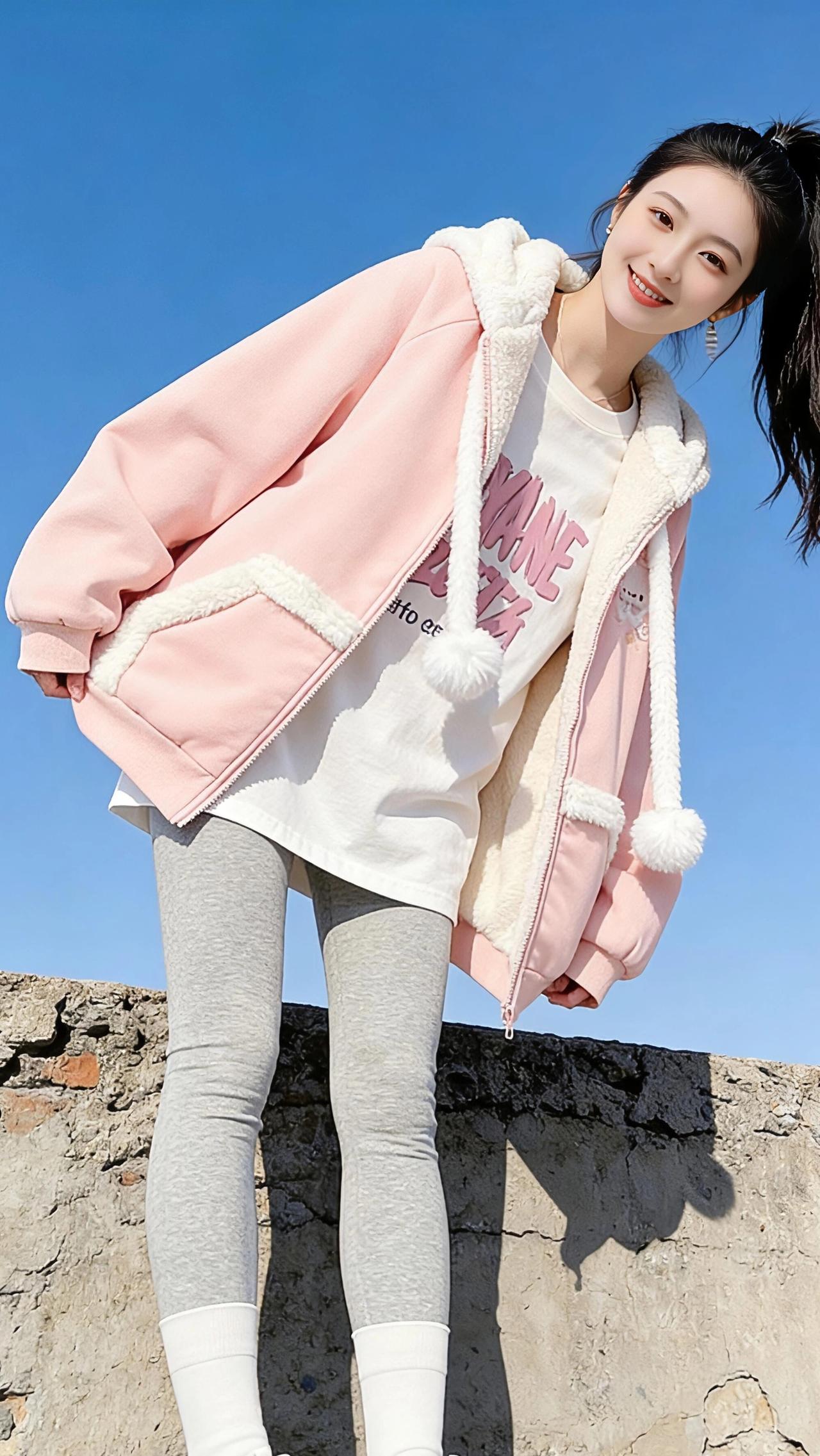 粉雾暖阳 浅粉的外套像一团温柔的云,被她轻轻披在肩上。毛绒绒的帽檐滚着米白的边,随着她抬手的动作,两颗绒球在风里轻轻摇晃,像春日枝头上初萌的花苞。 她站在斑驳的水泥矮墙之上,身后是漫无边际的晴空。那蓝,是被冬日寒风洗练过的澄澈,干净得没有一丝杂质,倒衬得她身上的粉色愈发软糯。卫衣上的粉色字母在阳光下微微发亮,与外套的颜色相映成趣,像是在小声诉说着少女的心事。 她时而歪头浅笑,马尾辫在身后划出俏皮的弧度;时而舒展双臂,让外套里的绒毛在风里翻涌,像晒过太阳的云朵,蓬松又温暖。浅灰的裤腿包裹着纤细的脚踝,白色的袜子和运动鞋让整个人都轻盈起来,仿佛下一秒就要迎着风,奔向更远的地方。 这不是凛冽寒冬里的瑟缩,而是属于少女的、独一份的鲜活与明媚。她把粉色穿在身上,把阳光揣进兜里,在料峭的风里,笑成了一幅最温柔的画。 每日搭配分享👗时尚穿搭 高级感穿搭 新年穿搭 冬季穿搭