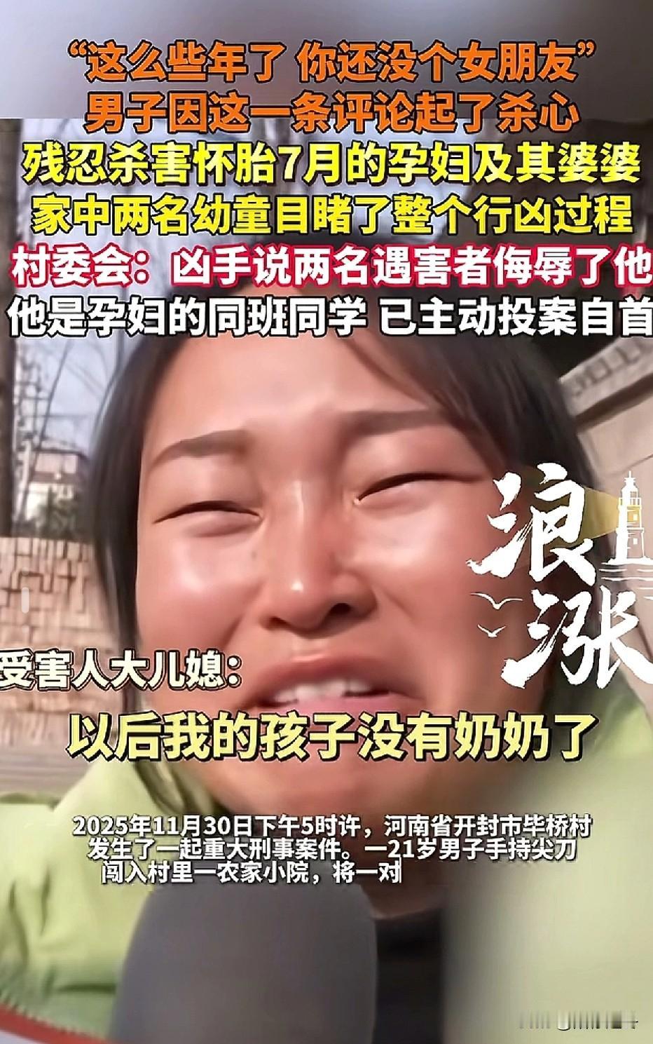 男子因1条评论杀害2人! “这么多年,你还没有女朋友”这句话直接让男子破防,起了报复心理,走向极端,祸从口出这句话说的一点不错,所以大家谨言慎行,管好自己的嘴! 2月7日,据媒体报道,河南开封发生了一起重大恶性刑事案件,然而事情起因竟然只是一句评论留言导致的。 起因是21岁男子和遇害女子是同班同学,两人5年多也没有任何联系,但近期两人在抖音上有过简单互动。 女子开玩笑式的在其视频里评论:“这么多年了,你怎么还没有女朋友。”话语间透露出一点点嘲讽的意思。 可能是说着无心,听者有意了吧,此话像一根针一样扎在男子心里,其感觉到自己被羞辱了,越想越气便开始展开报复! 2025年11月30日下午,21岁男子手持尖刀躲过监控,穿过邻居家来到院子里,将毫无防备且怀孕7个月的女同学和她的婆婆两人残忍杀害。 更让人心碎的是,现场还有两名分别是6岁和2岁的孩子,亲眼目睹了男子行凶的全部过程,这得给孩子造成多大的心理阴影呀! 目前该男子已经投案自首了,被害家属强烈要求判处其死刑,具体判罚还要等官方通报! 希望大家发表评论要谨慎啊!有些话题争论在所难免,文明上网,遇到不同意见不要太较真,上网为了放松,置气伤身不值得!