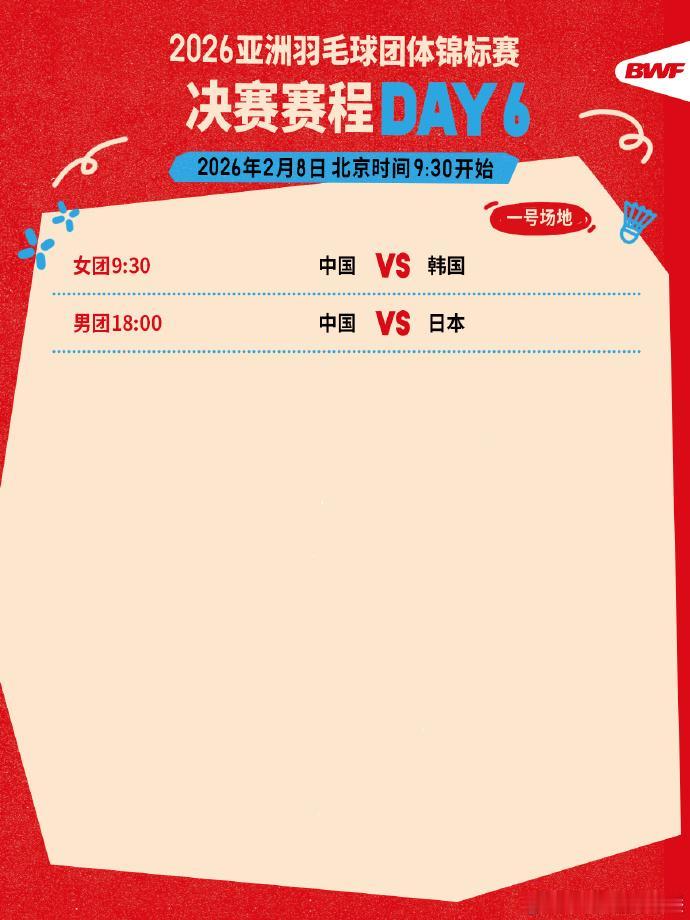 2026亚锦赛团体赛 国羽都打进决赛,男团上演大逆转 2026年亚洲羽毛球锦标赛,昨天结束了男团和女团半决赛的争夺,国羽表现相当出色,都打进了决赛。其中女团3比0中国台北,率先晋级决赛;男团则让二追三上演的大逆转击败韩国,晋级决赛。小伙子们的表现真不错,尤其是首次登场的二双陈俊廷/刘峻荣,敢打敢拼。 【男团半决赛:中国 3-2 韩国】 1、王正行 19-21、21-16、13-21 俞泰彬 2、何济霆/任翔宇 15-21、17-21 真龙/金元浩 3、胡哲安 21-13、21-19 崔智勋 4、陈俊廷/刘峻荣 21-15、21-14 赵松炫/奇东柱 5、董天尧 21-6、21-19 赵贤佑 【男团半决赛:日本3-1印度尼西亚】 西本拳太20-22 16-21乌拜迪拉 熊谷翔/西大辉21-16 21-17阿迪安托/卡尔南多 田中涌士21-11 21-15普拉迪斯卡 野村拓海/霜上雄一21-17 21-15因陀罗/华金 【女团半决赛:中国 3-0 中国台北】 1、高昉洁 18-21、21-17、21-16 邱品蒨 2、贾一凡/张殊贤 21-11、21-7 许雅晴/宋祐媗 3、徐文婧 16-21、21-10、21-13 林湘缇 4、陈樊淑湉/刘嘉悦 vs 许尹鏸/杨景惇 5、袁安琪 vs 宋硕芸 【女团半决赛:韩国3-1印度尼西亚】 金佳恩21-5 21-4塔丽塔 白荷娜/金慧贞21-14 21-10阿莱西娅/费比 朴佳恩14-21 13-21普拉蒂维 李瑞珍/李妍雨21-19 21-19阿玛莉亚/拉马丹蒂 【女团决赛:中国 vs 韩国】 1、韩千禧 vs 安洗莹 2、贾一凡/张殊贤 vs 白荷娜/金慧贞 3、徐文婧 vs 金佳恩 4、陈樊淑湉/刘嘉悦 vs 李瑞珍/李妍雨 5、袁安琪 vs 金敏智 PS:2月8日早上9点30分开打,加油咯