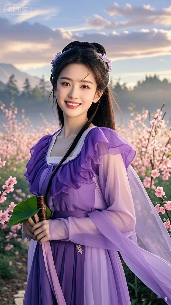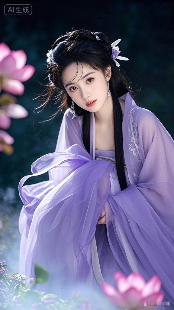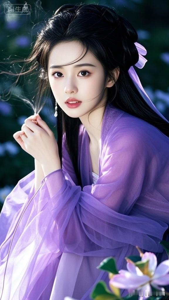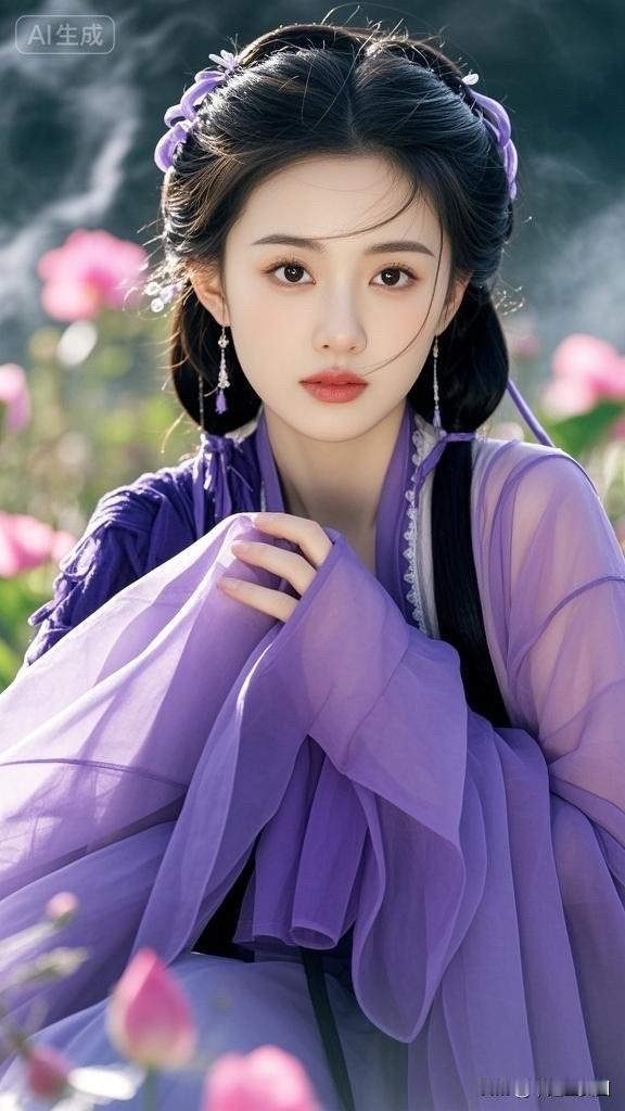 古风少女,黑纱飘逸,粉花点缀,如梦如幻。
