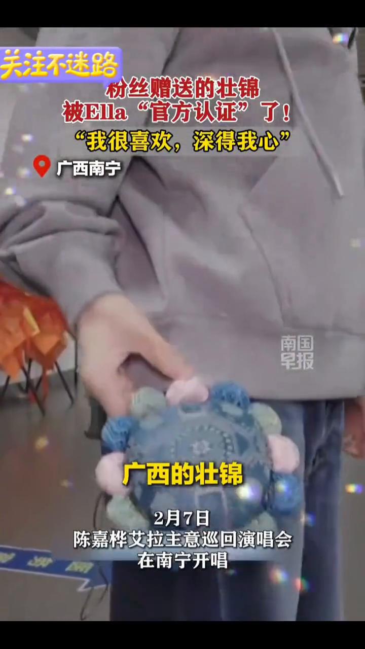 粉丝赠送的壮锦被Ella"官方认证"了!"我很喜欢,深得我心。 南国早报。 2月7日,陈嘉桦艾拉主意巡回演唱会在南宁开唱。当天,她在社交平台晒出粉丝赠送的壮锦饰品,并回应称这些礼物"深得我心"。 你看我身上,广西的壮锦做的这个小太阳,三叶草的别针,耳朵的耳环,这里还有个发夹。这些壮锦,这些布真的深得我心,我很喜欢。 来源:陈嘉桦@沿海小站。