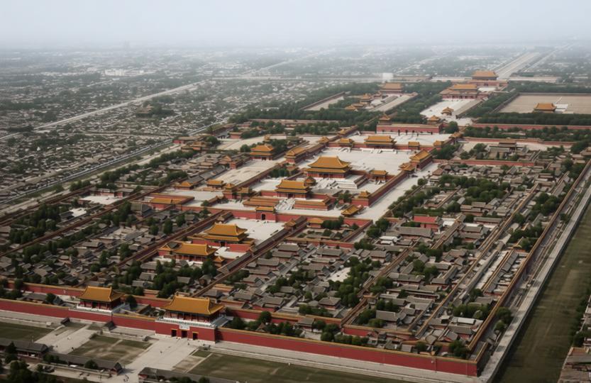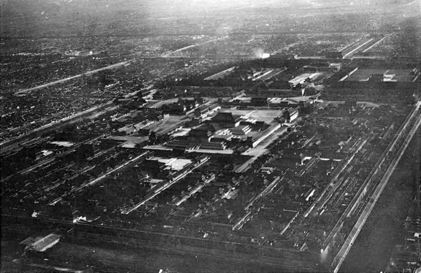 这是一张极为罕见的晚清北京紫禁城航拍照片,由八国联军侵华期间的法国随军摄影师普莱桑上尉拍摄,是现存最早的紫禁城航拍影像之一。 1900年八国联军入侵北京后,普莱桑上尉借助热气球等早期航空设备完成了这次拍摄。这不仅是紫禁城首次从空中被记录,也是中国历史上最早的一批航拍影像,照片中,紫禁城的宫殿群布局规整,中轴线清晰可见,周边的胡同、民居与皇家宫殿形成鲜明对比,完整呈现了晚清北京内城的城市肌理。