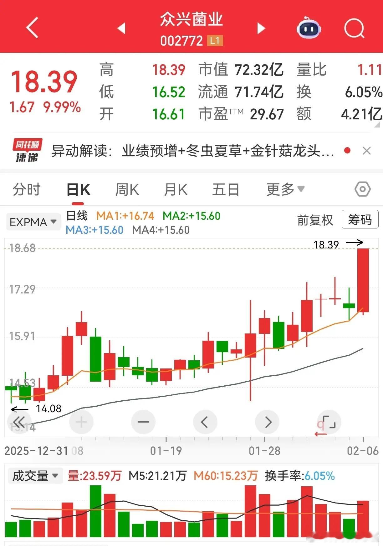 其实我选标的一直偏启动和横盘低吸,德美化工1月14日首次分享时8.01元刚启动,二次分析9.11元,如今已到10.05元;众兴菌业2月2日16.41元分享,现在18.39元;还有新华都、二六三,分享时都是横盘状态,根本谈不上高位,后续也都有稳步的收益空间。