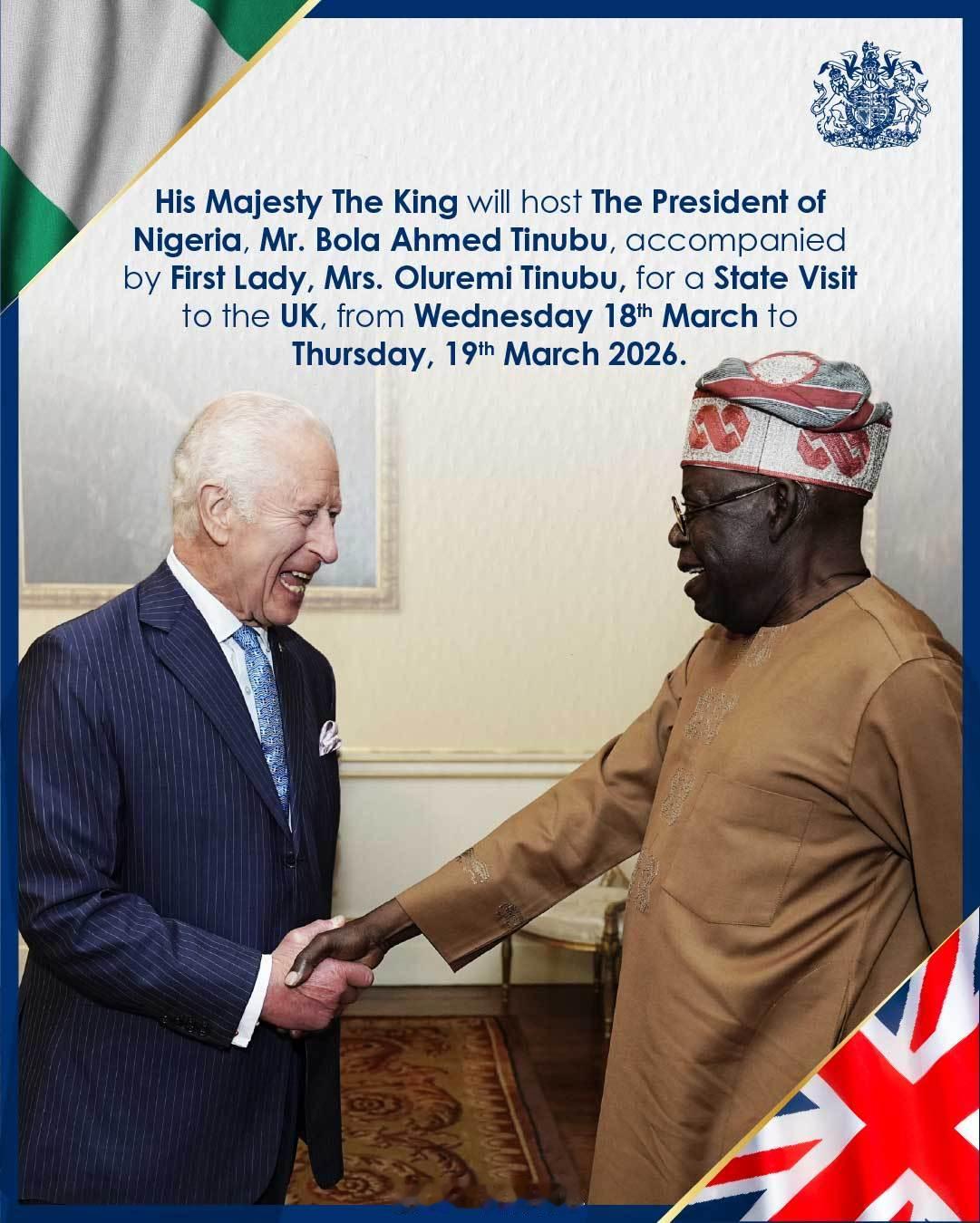 【预告】2026年3月18日至3月19日,查尔斯三世将会在温莎城堡主持国访,欢迎尼日利亚总统Bola Tinubu访英🇳🇬