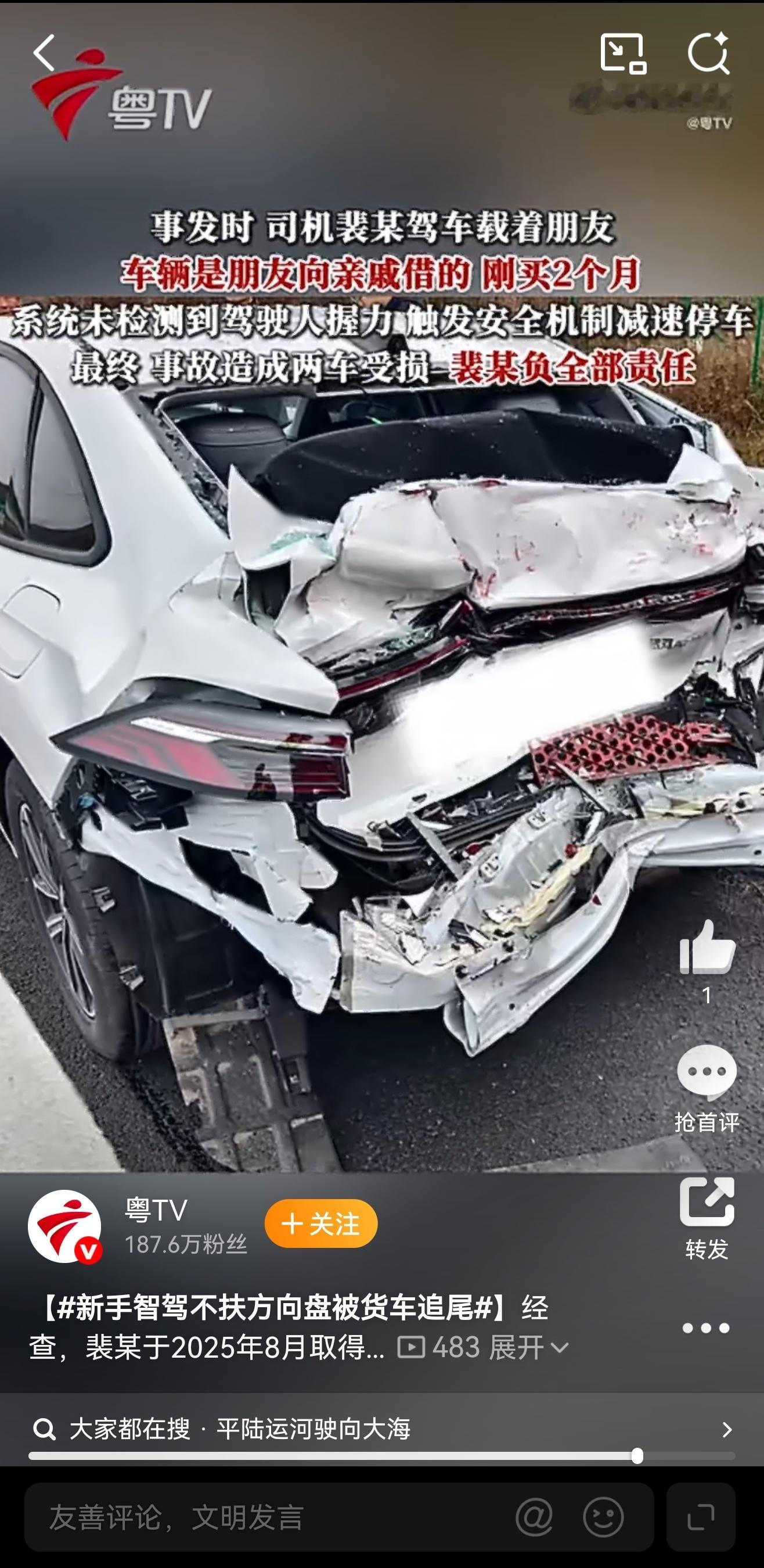 新手司机裴某拿驾照才半年,借朋友新车上高速,觉得「智驾」很酷,直接双手离开方向盘想当甩手掌柜。