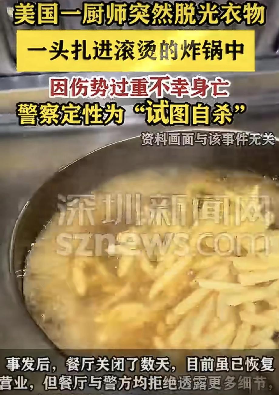 天啊,这新闻看得人心里一揪。 美国宾州一家餐厅里,一名厨师突然脱光衣服,一头扎进滚烫的炸锅。旁边同事拼命去拉,都没拦住……最后人没救回来,还有个女员工在拦的时候受了伤。当时店里有顾客,估计大家都吓坏了。 事发后餐厅关了好几天,现在虽然重新开门,但警方和店家都不愿多说,只说是自杀。好好一个人,用这么极端的方式结束生命,背后肯定有不少我们不知道的苦楚。可能是心理扛不住了,也可能是工作压力大到崩溃……具体原因外人很难猜。 哎,活着不容易。不管遇到多难的坎儿,真要给自己找个出口,找人说说、帮一把,别独自硬扛。也希望大家对身边人多一分留意,有时候一句关心,说不定就能拉住一个正在下沉的人。 愿他安息吧。 美国餐饮新闻 美国后厨 美国餐饮动态 珍惜生命