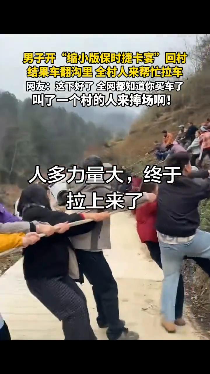男子开"缩小版保时捷卡宴"回村,结果车翻沟里全村人来帮忙拉车。 网友:这下好了,全网都知道你买车了,叫了一个村的人来捧场。 2月7日(发布)贵州。人多力量大,终于拉上来了。