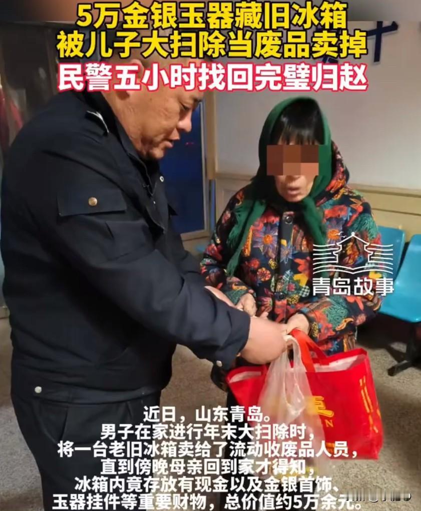 山东青岛的张先生趁着年末大扫除处理旧家电,随手把家里一台老旧冰箱卖给了收废品的,本是件平常事,结果傍晚母亲回家后一句话让他瞬间慌了神,这台旧冰箱里竟藏着母亲攒下的现金、金银首饰和玉器挂件,总价值足足五万多块,张先生赶紧报警求助,好在青岛民警火速出手,不到五个小时就把所有财物完好无损找了回来,虚惊一场的张先生和母亲对着民警连声道谢。张先生本来想着年末给家里来个彻底的大扫除,把用不上的旧家电都清理掉,这台老旧冰箱放了挺久没人用,看着占地方,他也没多想里面有没有东西,就喊来流动收废品的人员,谈好价格后直接把冰箱拉走了。整个过程顺顺利利,张先生收拾完其他地方,就等着母亲回家一起吃晚饭,压根没把卖冰箱这事放在心上。直到傍晚母亲回家,发现旧冰箱不见了,急忙问张先生冰箱的去向,得知冰箱被卖掉后,母亲瞬间慌了神,赶忙告诉张先生,那台冰箱的夹层和储物格里,藏着她平时攒下的现金,还有金镯子、银项链、玉器挂件之类的金银首饰,这些东西加起来总价值有五万多块,都是她格外珍视的财物,就这么被当成废品卖了,母子俩都急得团团转。回过神的张先生第一时间拨打了报警电话,跟民警详细说明情况,包括卖掉冰箱的具体时间、收废品人员的体貌特征,还有对方驾驶的车辆信息。民警接警后丝毫不敢耽搁,立刻展开摸排工作,根据张先生提供的线索,一路调取监控、走访排查,很快就锁定了回收这台冰箱的车辆踪迹,顺着线索追踪到了平度南村镇沙岭村的一家回收站,成功找到了收废品的人员。面对民警的询问,收废品人员了解情况后十分配合,带着民警在堆积的废旧物品里仔细翻找,很快就找到了那台被卖掉的旧冰箱。民警当场打开冰箱清点,母亲藏在里面的现金、金银首饰和玉器挂件全都好好的,一件没少、完好无损,此时距离张先生报警还不到五个小时。当天晚上,民警就把这些失而复得的财物悉数交还给了张先生和他的母亲,看着找回来的财物,母子俩激动不已,一个劲地向民警道谢,连连感慨民警出警快、办案效率高,帮自己挽回了不小的损失。旧冰箱 来源:青岛故事