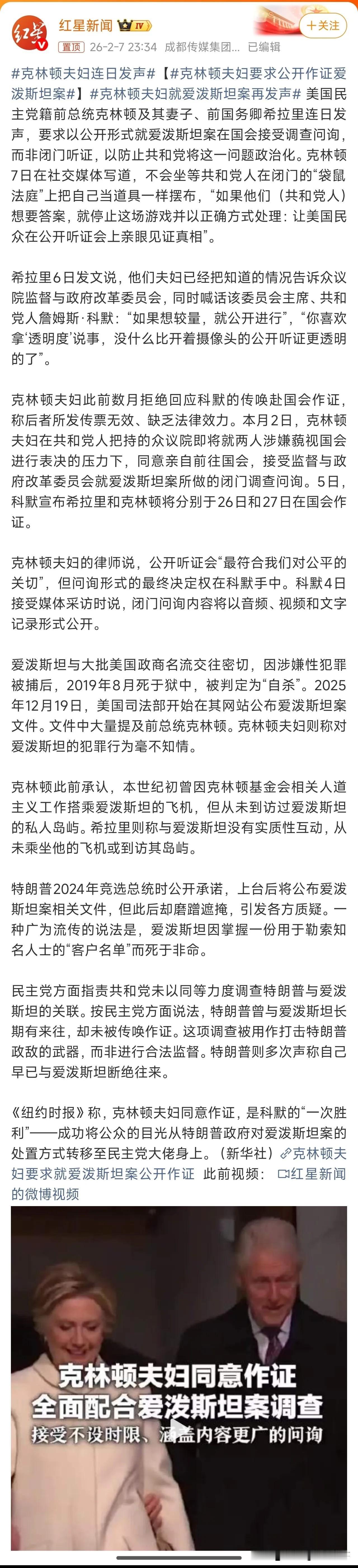 克林顿夫妇这步棋够狠,要公开作证爱泼斯坦案了! 放话要全公开,要死一起死,不能只把矛头对准自己。这是摆明了要鱼死网破——反正大家都和爱泼斯坦关系不清不楚,特朗普跟他的来往甚至比谁都密。 那不如就站出来作证,好好跟全美国、全世界说道说道,让所有人都看看美国这堆烂事。老话说“光脚的不怕穿鞋的”,他们这是把自己逼到了墙角,也把别人拉了过来。 共和党要是不想引火烧身,就得掂量掂量。为了自保,是不是该给克林顿夫妇留条路?毕竟真把事全抖出来,谁的面子都挂不住,谁的屁股都不干净。 这皮球算是彻底踢给了共和党,踢给了特朗普。你要是还想捂着盖着,就得默许我过关;你要是非要揪着我不放,那大家就一起掀桌子,谁也别想好过。 这种玉石俱焚的架势,透着一股破釜沉舟的狠劲。爱泼斯坦案本就像个烂泥潭,谁沾谁一身腥。克林顿夫妇这一闹,等于把泥潭里的人都往水面上拽。 平时你好我好大家好,真要摊开在阳光下,那些见不得人的勾当、说不清的关系,怕是要让美国政坛抖三抖,特朗普和共和党这会儿怕是坐不住了,是硬着头皮让克林顿夫妇开口,然后等着自家的丑事被扒光? 还是捏着鼻子认了,放他们一马,把这摊子事继续烂在肚子里?怎么选都难。这种较量,哪是什么正义对决?分明是利益捆绑下的互相要挟。你手里有我的把柄,我手里也攥着你的黑料。 真要撕破脸,谁都别想体面。克林顿夫妇算准了这一点,才敢放出“全公开”的狠话。美国的这摊破事,捂着盖着这么久,早成了藏污纳垢的地方。克林顿夫妇这一闹,说不定真能撕开个口子。 只是这口子撕开后,溅出来的脏水,会浇到多少人身上?说到底,这不是什么勇敢站出来揭露真相,是走投无路后的绝地反击。用公开作证当武器,逼着对手妥协。 这种玩法,把美国政坛那点虚伪的遮羞布扯得干干净净。最后会怎样?大概率还是各退一步,把这事继续压下去,毕竟谁也不想真的“一起死”。 只是经此一闹,大家心里都清楚,这潭水有多深,这水底下的龌龊,又有多少。克林顿夫妇这步险棋,算是把所有人都架在了火上。 至于最后谁先松口,谁能保住自己,就看谁的软肋更少,谁的胆子更硬了。