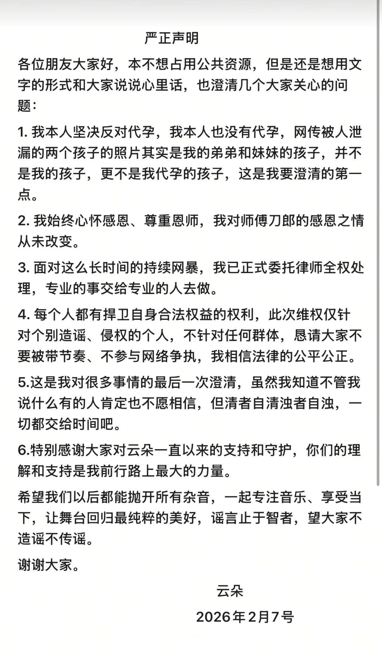 云朵深夜发声,这位歌手主播还是忍不住了。2月7号当天晚上深夜,云朵发布了严正的声明,对于近期网络上所传播的一些事情进行了再次回应,并表示很多事情应该是最后一次澄清了。云朵说自己坚决反对代孕,本人也没有这样做。网上传播的两个孩子的照片是自己的弟弟和妹妹的孩子。对于刀郎,始终心怀感恩,尊重恩师,并且对师傅的感恩之情从未改变。对这么长时间的网暴已经委托律师全权处理专业的事交给专业的人去做。说每个人都有捍卫自身合法权益的权利,这次维权仅针对个别造谣侵权的个人不针对任何群体,恳请大家不要带节奏,不要参与网络争执。相信清者自清浊者自浊,一切交给时间,在声明的最后云朵呼吁以后能够抛开所有的杂音一起专注音乐享受当下,让舞台回归最纯粹的美好,谣言止于智者。 洋洋洒洒几百个字,能够看得出,这位歌手主播对于网上的很多言论所造成的压力已经不堪重负了。先来说一下代孕这个事啊,在我国这个事件不仅仅是触碰法律的,更是在道德层面不容允许的。无论是公众人物还是平凡人,一旦出现这种行为,必然要受到法律的制裁。云朵作为一个公众人物,在这件事情上心知肚明。所以在反对代孕自我澄清这个方向上,我个人觉得云朵如果真的想打一个翻身仗的话,还是要拿出切实的证据。而不是写几个字说几句话就能够澄清这么简单的。而至于和刀郎之间的关系以及云朵本人的感恩,其实一直到现在为止,两个人之间的具体的情况到底是怎么样?外人不得而知,但是实际的情况是在这里摆着的,那就是与刀郎复出已经这么长时间了,云朵既没有在公开场合和刀郎互动,也没有参与刀郎的新歌录制发行以及山歌巡演活动,如果是正常的师徒关系的话,按理说这位女士是应该或多或少的有参与和互动的。现在是不仅没有相关的联系,而且刀郎方面也早就发布了师徒关系和工作关系的澄清声明。所以,即便是感恩,那也只是云朵单方面的想法和做法了,两人确实看不出再有什么瓜葛!而且云朵在声明中是用师傅来称呼刀郎的,师傅和师父是不一样的。师傅只是传授技能,教本领了,而师父除了传授技术之外,还像是父亲一样,这里面的感情深意不一样。 然后还有被网暴这件事情,云朵也是特意强调自己针对的是侵权和造谣的个人,而不针对任何群体,我相信这个群体大概率指的是稻米群体。从这一点上来看,云朵其实并不想犯众怒,主要还是要精准的找到个人,进行维权。 如果对于云朵的这份严正声明进行总结的话,我个人认为,算是云朵的一种个人态度也算是对于网上的一些情况的一种警告,而至于最终能否起到有效的警告或者是震慑的作用,还是要看云朵口中所针对的造谣和侵权的个人手中,有没有切实有效的一些证据?如果他们有证据的话,那么云朵光凭几行字和一纸声明,恐怕没有什么作用。所以还是那句话,如果这位歌手主播想要切实的维护权益并且进行反击的话,真的要拿出实打实的证据,实打实的动作来,不然的话,网上的一些情况和行为恐怕会一直存在。