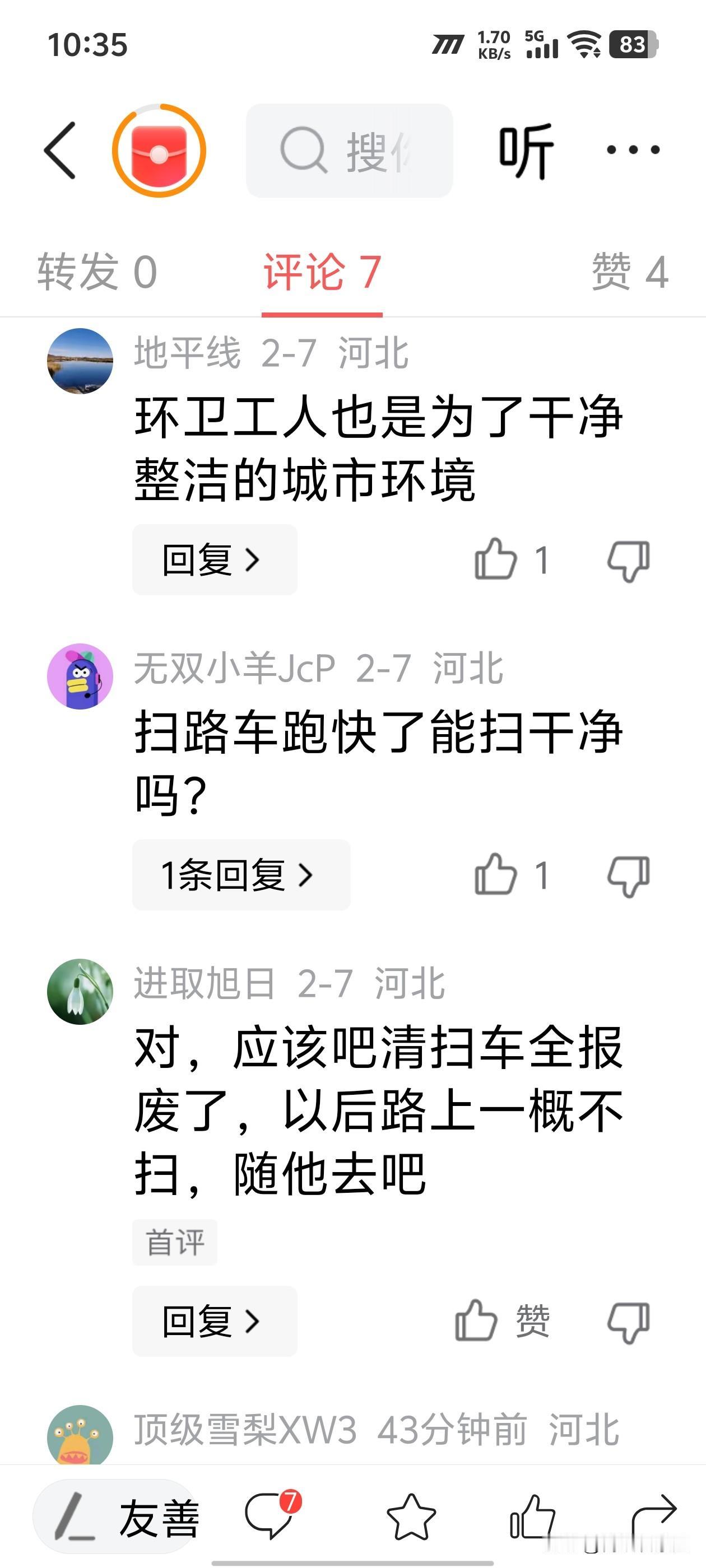 我就纳闷了,怎么喷子这么多? 但凡开车走过二环,都不至于发这种评论! 石家庄二环是快速路,限速80! 清扫车上二环,龟速行驶,太危险了! 轻则堵车,重则有可能会追尾! 这么简单个道理,怎么也有喷子?