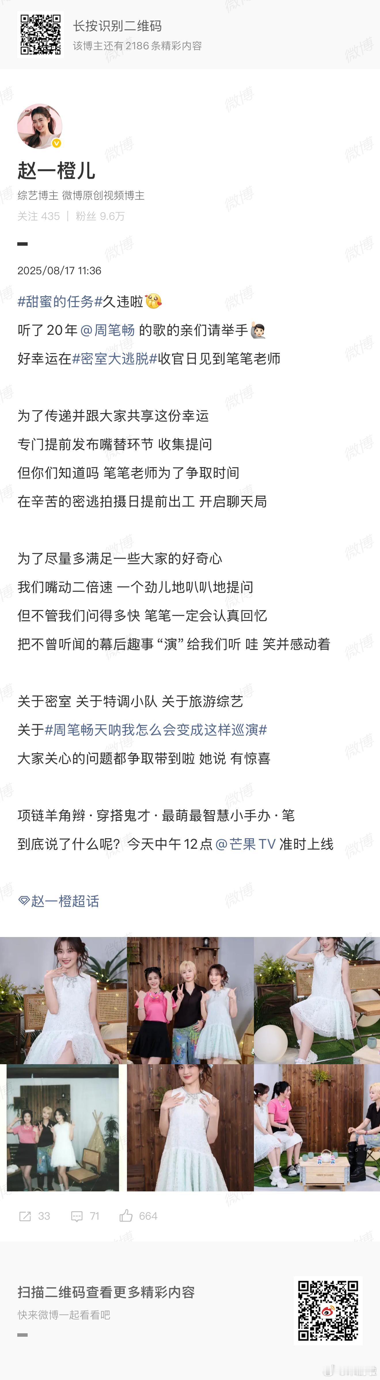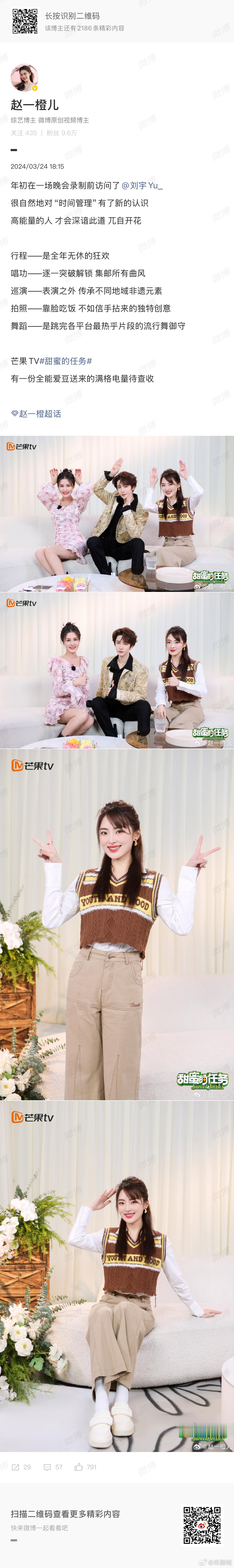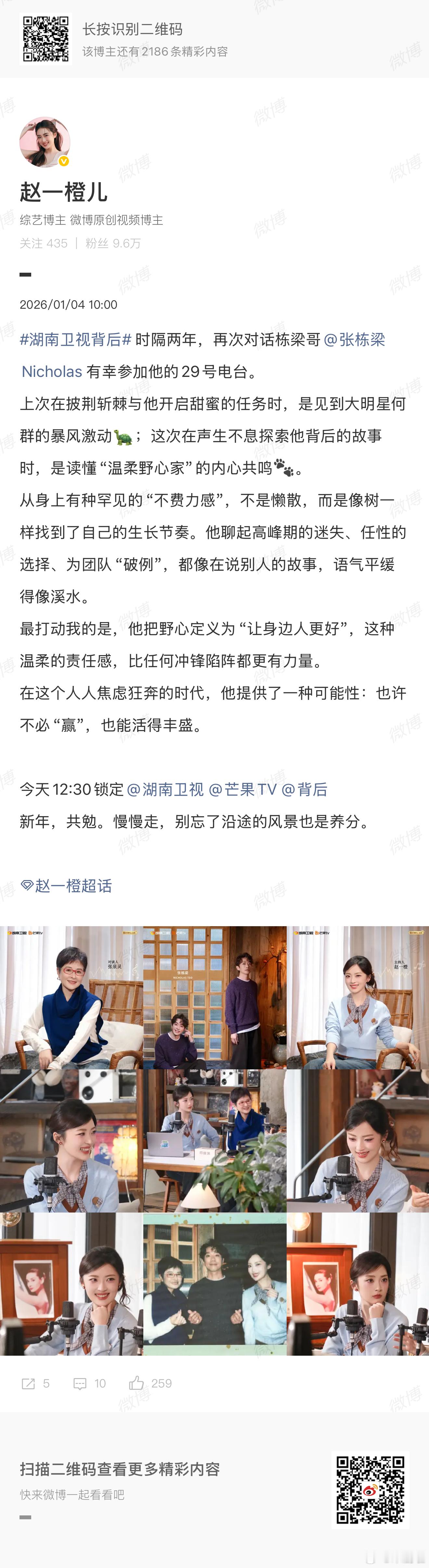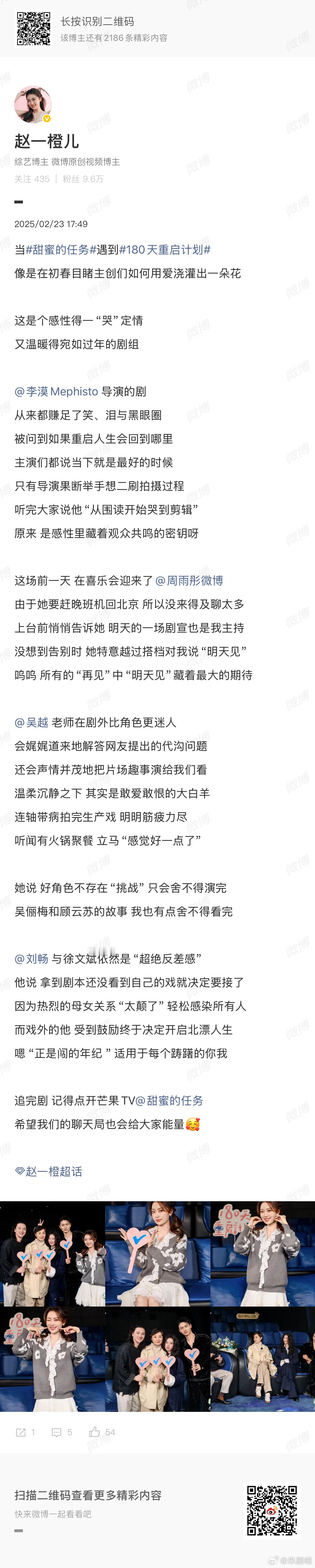 芒果女主持上新了 真的有被的坚持和用心打动!从2023到2026,连续四年gei所有采访过的艺人写小作文!也看到中国网络视听盛典合作过的刘宇和周雨彤的小作文了!从芒果TV《甜蜜的任务》到湖南卫视《背后》 真的是用热爱把一件事做到极致[爱心][爱心][爱心] 向全世界安利赵一橙