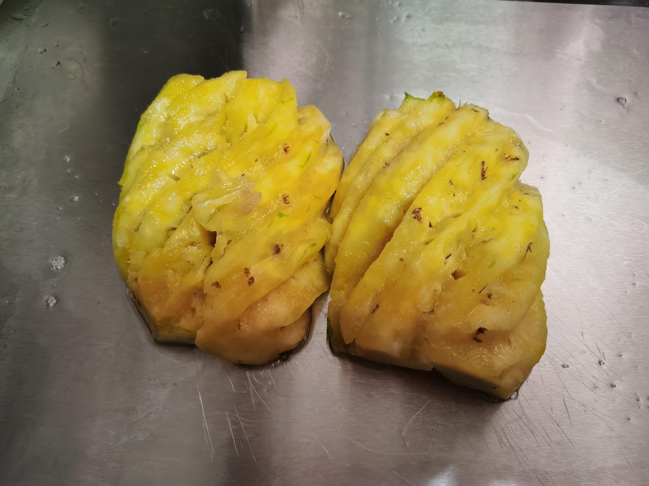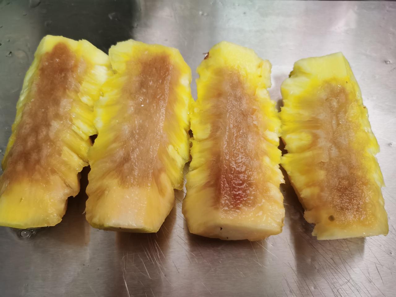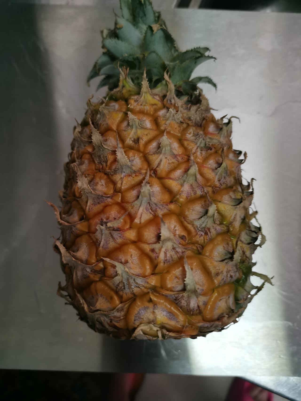 买的凤梨收到的是菠萝, 也不是不能吃...... 我忍了, 主要是这个时间退换货很是问题, 好在家里还是有菠萝刀的。 费劲巴拉的削好了皮、去了眼。 切开一看[流泪][流泪], 白忙活了。 还要再削一个[快哭了][快哭了]。