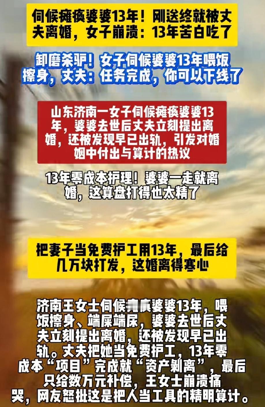 妻子伺候瘫痪婆婆13年,刚给婆婆送完终,老公就迫不及待的要离婚了。 这个山东济南的王女士也太冤了吧!13年如一日的给婆婆喂饭、擦洗身子、伺候大小便,换来的却是被卸磨杀驴。 王女士还发现自己的丈夫在自己辛苦伺候婆婆的时候,人家早就出轨了,婆婆一下线,老公迫不及待的要把旧老婆扫地出门,迎娶新老婆要奔向自己无忧无虑的小日子了。 夫妻之间算计如此,真让人寒心,面对丈夫现在扔几万块钱就想打发走自己,换谁也咽不下这口气!希望王女士能够争取到自己的利益,维护自己的尊严。
