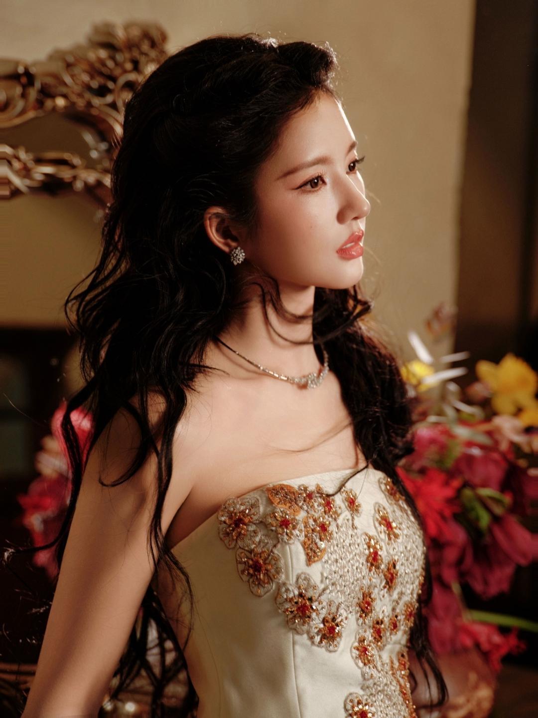 鎏金绣繁花,柔光映佳人。刘些宁一袭抹胸刺绣礼裙惊艳亮相,暖调复古光影勾勒温婉轮廓