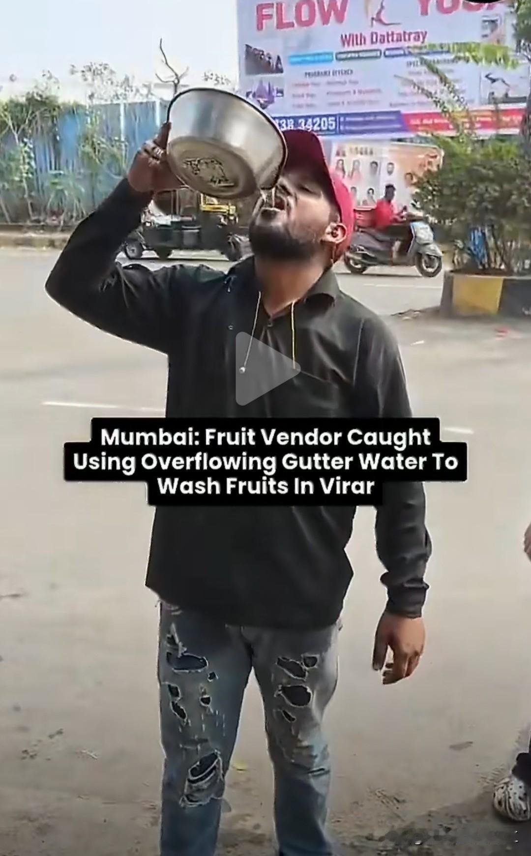 印度水果小贩喷洒街头脏水为所卖瓜果保湿,被路人指责,小贩为了证明街水清洁,直接举杯饮之!