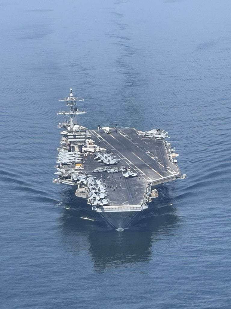 维特科夫和库什纳今日与中央司令部司令布拉德·库珀上将一同登上位于阿拉伯海的亚伯拉罕·林肯号航空母舰。
