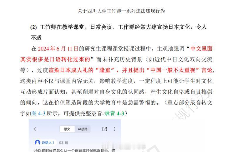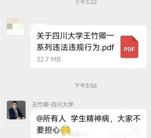 学生称王竹卿被举报后消极应对 学生举报其学术不端、财务舞弊,师德失范但最严重的是政治立场、民族立场问题,根据学生举报的材料,这是一个极端亲日分子。学生说王竹卿与家人拥有日本永久居留权,他多次在多个场合不顾中国人民情绪发表亲日言论,鼓吹日本,贬低我国,他长期在工作群大力宣扬日本精神与文化氛围!一名教师存在严重政治立场问题,其造成的危害远超一般职业失范,具有隐蔽性、长期性和破坏性,不仅是在“误人子弟”,更是在动摇国本、侵蚀未来。对这类行为,不知道川大是如何看的