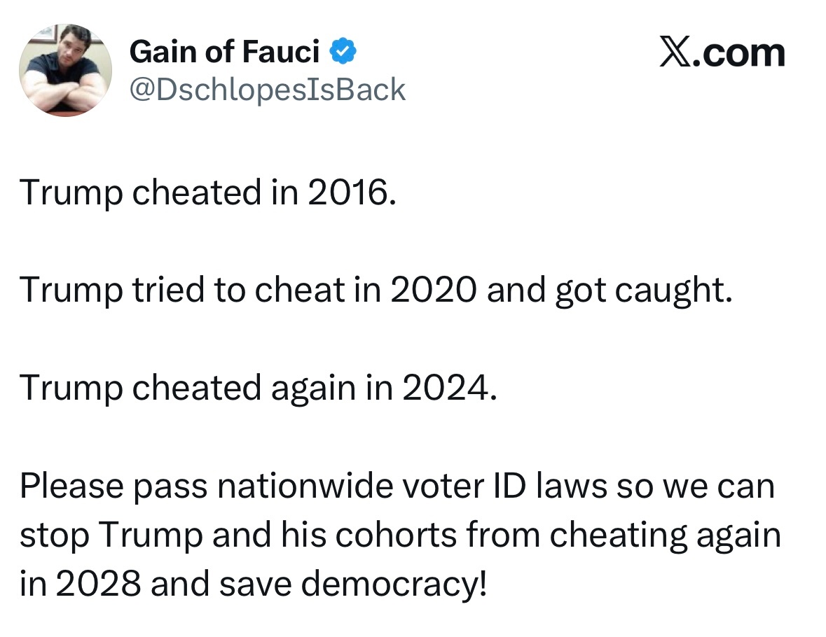 “特朗普在2016年作弊。特朗普在2020年试图作弊,结果被抓了个正着。特朗普在2024年又一次作弊。请在全国推行选民身份证法,这样我们才能阻止特朗普和他的同伙在2028年再次作弊,拯救民主!”这条简直要笑死我!热点现场海外新鲜事