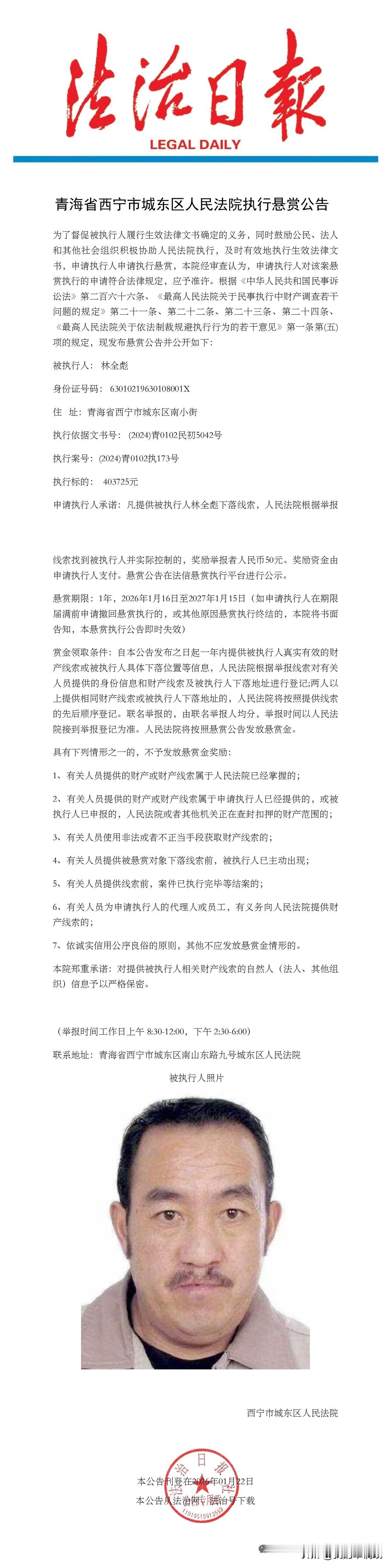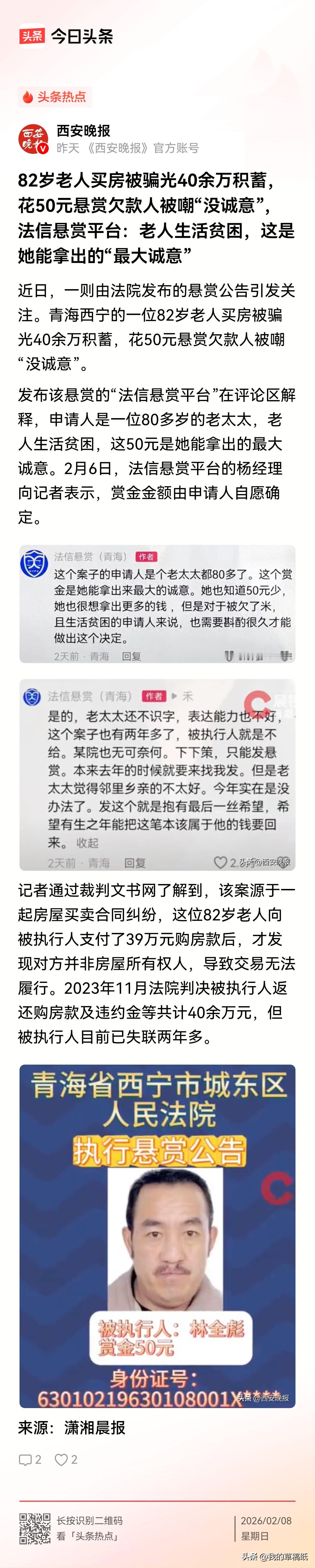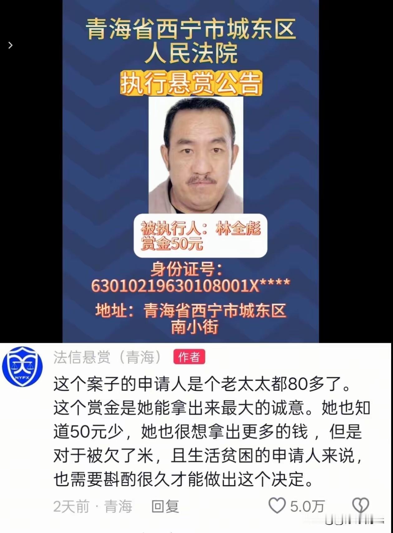 青海西宁,一老赖欠40万玩失踪,80岁老太出50元悬赏寻人执行,看着叫人泪目! 西宁城东法院一则悬赏公告刺痛人心:82岁方老太悬赏50元,寻找欠她40万房款并失联多年的老乡林金彪。 发布该悬赏的“法信悬赏平台”在评论区解释,申请人是一位80多岁的老太太,老人生活贫困,这50元是她能拿出的最大诚意。2月6日,法信悬赏平台的杨经理向媒体表示,赏金金额由申请人自愿确定。 登录裁判文书网查了一下,该案源于一起房屋买卖合同纠纷,这位82岁老人向被执行人支付了39万元购房款后,才发现对方并非房屋所有权人,导致交易无法履行。 从本案披露的事实看,这位名叫林金彪的老赖,其虚构房主,骗取老太39万购房款,本身具有诈骗的故意,法院以民事纠纷处理,疑似“以民代刑”,属处理失当。 建议此案移送公安以诈骗立案,追究刑事责任。上级法院或该院以审判监督纠正。 对此你怎么看?