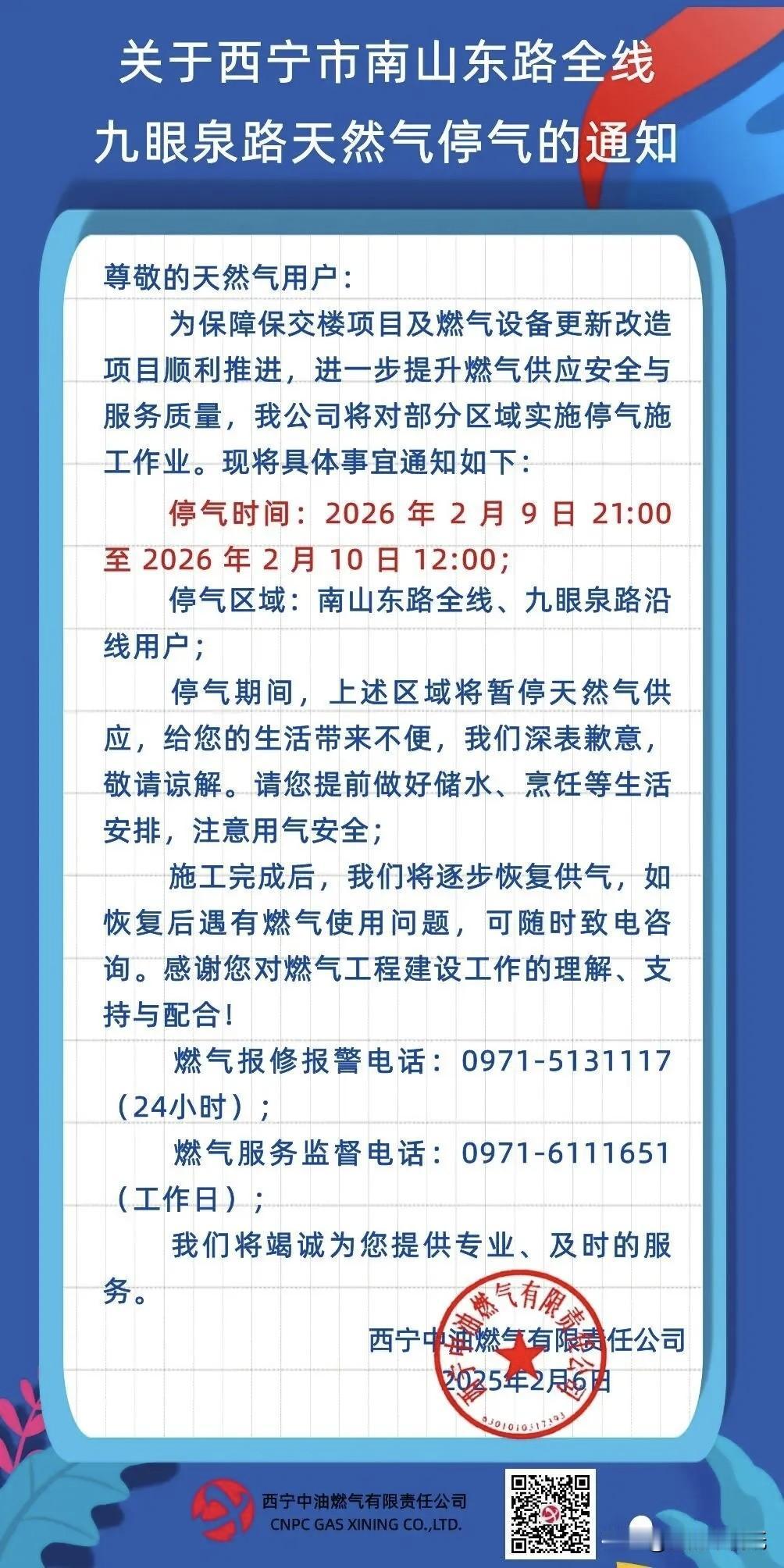 注意啦!西宁这些地方停气15小时! 南山东路、九眼泉路明天9点至后天12点全面停气!请相互转告,提前储水备餐,关闭阀门,注意安全。 生活不易,停气添堵,大家多体谅,早准备!