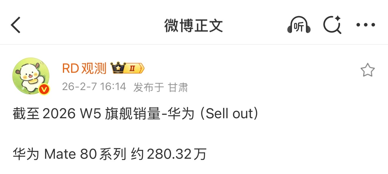 2026 W5(1.26-2.1),Mate 80系列sell-out累计约280.32万台,同比Mate 70系列同期增长约24%,相当于Mate 70的1.24倍,Mate 70上市66天(2025 W5)累计约226.07万台 Mate80已经表现很棒了我的鸿蒙体验华为harmonyos6