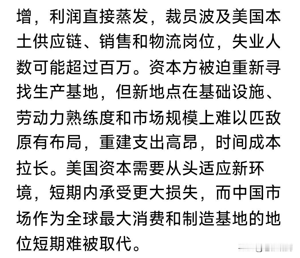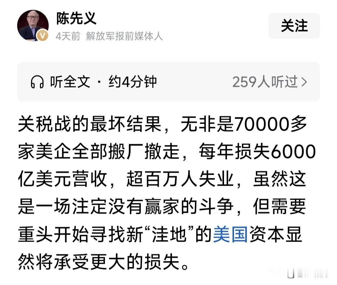 陈先义谈中美关税战,觉得比较客观!最坏结果无非是7万家美企搬走,每年损失6千亿营收,超过百万人失业! 这是一场没有赢家的“战争”,但美国资本需要重新寻找投资“洼地”。这一拆一建要花多少钱?何况有太多不确定! 实话实说,老陈这次分析,没有了过去的“斗争思维”,相对比较客观。比如:美资在华企业7万多家,如果全部搬走,我们每年将损失6千亿美元的营收,超百万人失业!说的都是真话实话。 尤其那句:这是一场没有赢家的“战争”!总结得更好。还有美资企业全部搬走,7万多家企业重新寻找“投资地”,再重新建厂,确实是一笔巨大的开支! 但若果真如此,将使我们超过百万人失业,每年减少营收6千亿,这个损失也不小!何况中美贸易额每年超万亿,中国顺差几千亿。总起来是多少? 而且不仅是美国,如果中美关税战,导致彻底断链,影响的不仅是中美合作,还有其他发达国家在华投资,开办的20万家企业呢?如果都搬走,他们当然损失很大,但我们要有多少人失业?每年要减少营收多少亿美元呢? 苍狼觉得包括美国在内发达国家,是我们最重要的贸易伙伴!除了川普上台之后加关税,引发世界贸易战,其他国家企业,还是守信用讲规则的!对于我们是利好,应该予以珍视!化解矛盾,求同存异,合作发展才是硬道理! 以上观点,不知对错?欢迎网友参与讨论,因为道理越说越明嘛! …………
