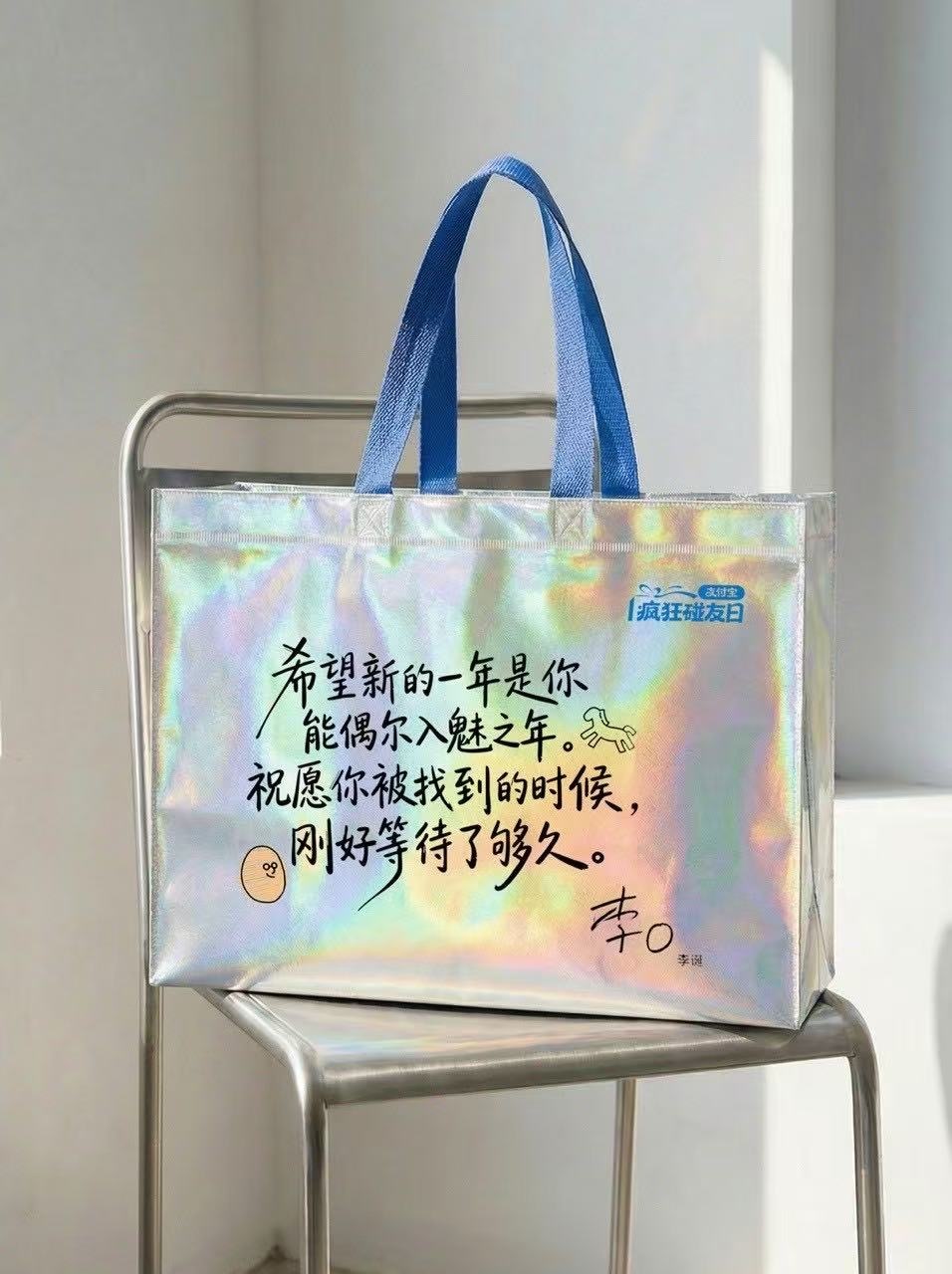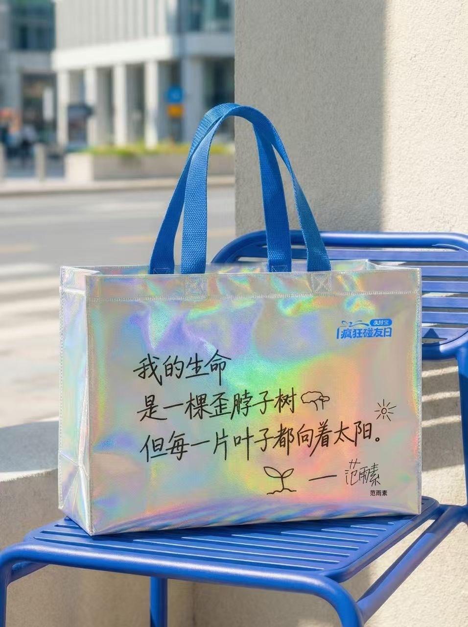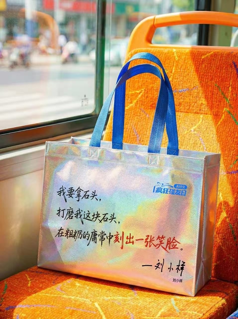 写在购物袋上的文字太有力量了25年前说出“我情愿痛苦,不要麻木”的刘小样,如今却说:“我要拿石头打磨我这块石头,在粗粝的庸常中刻出一张笑脸”。支付宝疯狂碰友日 将刘小样和其他7位名人的金句印在好彩头购物袋上,当你瞥见李诞关于“入魅”的祝福,你会微笑;当你读到范雨素“歪脖子树”的比喻,你会沉思;而刘小样的“打磨”,则会给你一个拥抱。2月6日起,前往盒马、零食很忙、赵一鸣零食、好特卖等线下门店,使用支付宝碰一下支付,就有机会获得同款购物袋。支付宝很懂当下大家的情绪,用强大的共情力让这些袋子上的文案在日常生活中轻轻接住你。