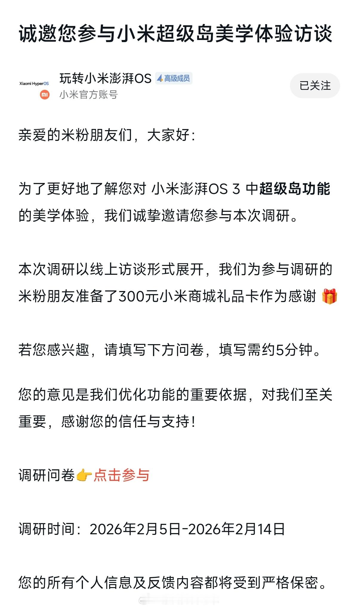为了更好地了解您对 小米澎湃OS 3 中超级岛功能的美学体验,我们诚挚邀请您参与本次调研。