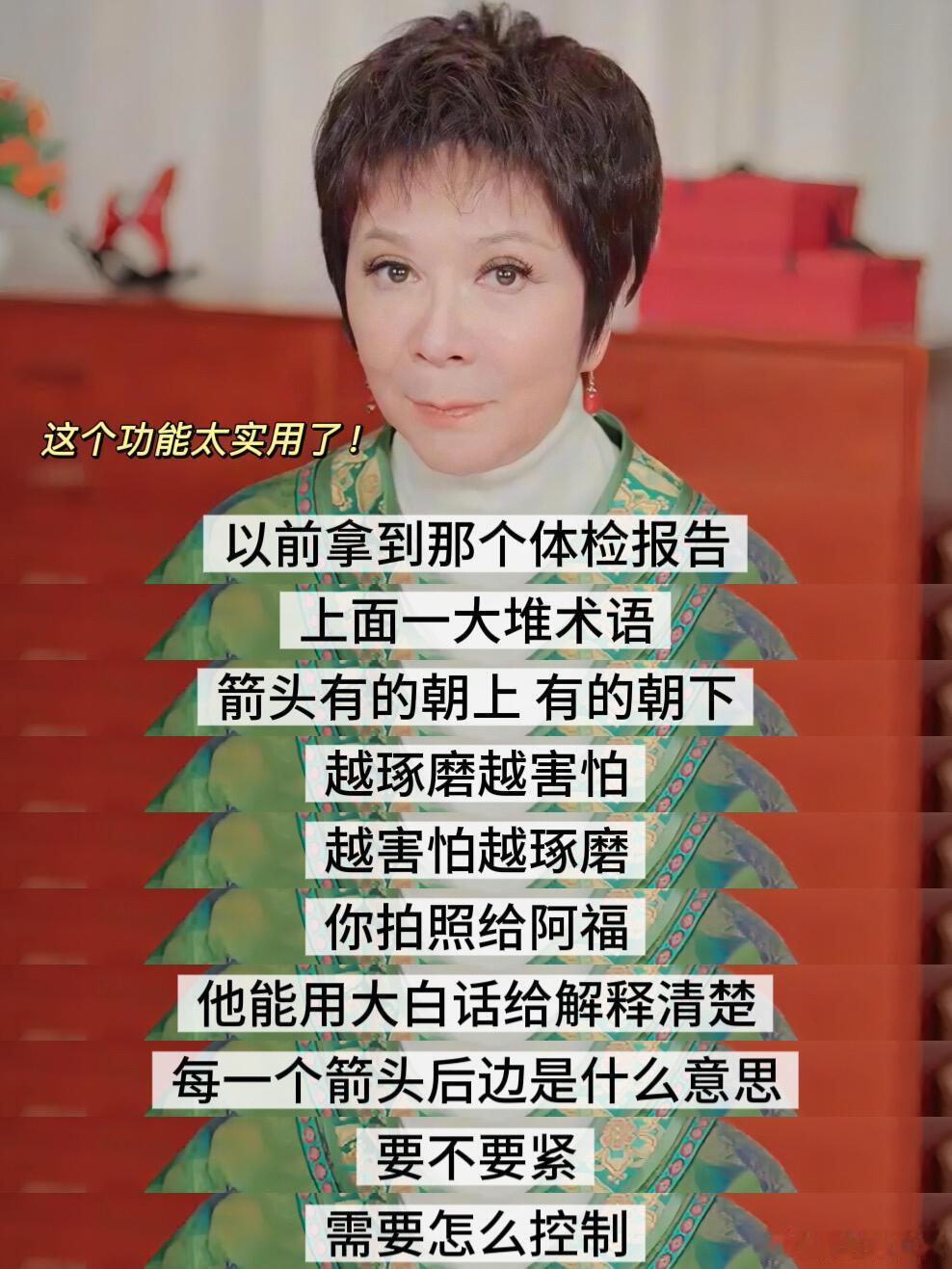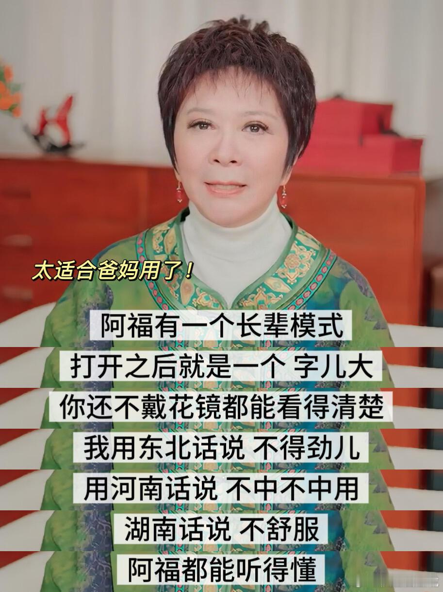突然发现AI都是蔡明玩剩下的。突然发现,蔡明老师很久以前,就跳过预言家了。谁还记得蔡明老师30年前的春晚小品《机器人趣话》,当时她演了很多类型的机器人,有女强人型、事业型、温柔型。这不就跟现在各种功能的AI对上了吗?当然蔡明的权威不仅于此,她不仅会表演,还会唱歌、会腹语,参加综艺更是金句频出,很有梗!60多岁的年龄,却有着20多岁的灵魂,精神状态超前,她虽然毒舌,但总能一针见血地指出问题的关键所在。刷到她谈及父母健康问题的视频之后,我好像更了解父母了。他们平时喜欢转发一些关于健康问题的文章给我们,我们可能会觉得那些文章在危言耸听,但在爸妈那个年龄段,有健康焦虑是很正常的事情。至于为什么爸妈不想去医院,蔡明的话,直接把我给点醒了,爸妈一个是怕花钱多,另一个则是他们不想麻烦子女,不想给我们带来负担。以前只觉得爸妈老顽固,说不通,现在则读懂了他们,蔡明可以说是两代人的嘴替。关于这些问题,蔡明分享的方法,我觉得很实用,用蚂蚁阿福,权威靠谱,爸妈再也不用去刷那些营销号的文章自己吓自己。打开长辈模式后,可以看清文字,支持语音播报,还可以识别方言,24小时在线,关于健康的问题,父母可以随时去问阿福。有这样一个健康小助手在父母身边,我们也能安心不少,跟父母的关系更亲近了。