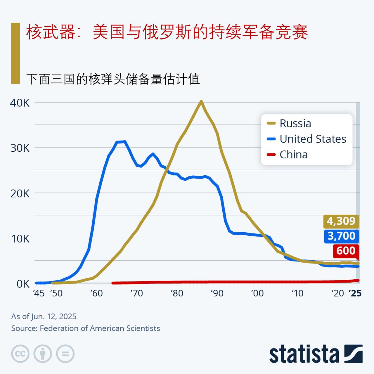 美俄核武库是如何演变的,目前它们还有多少核弹头? 2月5日是《新削减战略武器条约》生效 25 周年,同时也是该条约的到期日。该条约于 2010 年由巴拉克·奥巴马和担任一届总统且与普京关系密切的德米特里·梅德韦杰夫签署,它对战略核武器进行了限制,规定了部署的战略核弹头数量上限,并旨在通过核查措施(特别是数据交换和现场检查)来实现透明度和可预测性,以便双方能够监控对方的战略武器库并减少最坏情况的假设。尽管《新削减战略武器条约》是在俄罗斯和美国关系正在经历“重启”的时期签署的,但联合国秘书长安东尼奥·古特雷斯认为该条约的结束“在最糟糕的时刻到来”。他敦促两国尽快签署一项新的核武器控制协议,因为现有的条约在古特雷斯所说的“国际和平与安全的严峻时刻”到期了。 自广岛遭受原子弹轰炸至今已逾 75 年,而全球仍有超过 12000 枚核弹散布于各地,从蒙大拿州的导弹发射井到欧洲偏远的空军基地,甚至延伸至深海区域,那里潜伏着弹道导弹潜艇,作为一种几乎无法探测的威慑力量。广岛是 1945 年发生的两起原子弹爆炸中的第一起,所使用的炸弹威力为 15 千吨。而三天后在长崎进行的那次袭击所使用的武器则具有 22 千吨的威力。现代核弹头的威力要大得多,美国的“三叉戟”导弹可发射出 455 千吨威力的核弹头,而俄罗斯的“SS”洲际弹道导弹则有 800 千吨的威力。据美国科学家联合会的数据,美国和俄罗斯共拥有全球约 90%的核武器,两国的核武器储备总计超过 8000 枚。若将退役但仍完好无损、等待拆除的核弹头计算在内,这一数字将超过 11000 枚。 尽管这些数字相当庞大,但与冷战高峰期存在的核弹数量相比,仍表示出了一定程度的大幅减少。下面这张信息图展示了核弹储备的变化情况,特别是考虑到各种军备限制条约的影响。在 1987 年美国和苏联签署《中程核力量条约》之后,核弹数量显著下降,当时两国拥有超过 60000 枚核武器。 近年来,中国加大了其核武器库的规模:据有关报道,在近十年间,中国核武器数量增加了近一倍,从 2016 年估计的 260 枚增加到了2025年的 600 枚。尽管美国方面称中国战略核武器库的迅速扩张正在改变全球核力量的平衡,但就核能力而言,中国仍远远落后于美国和俄罗斯。