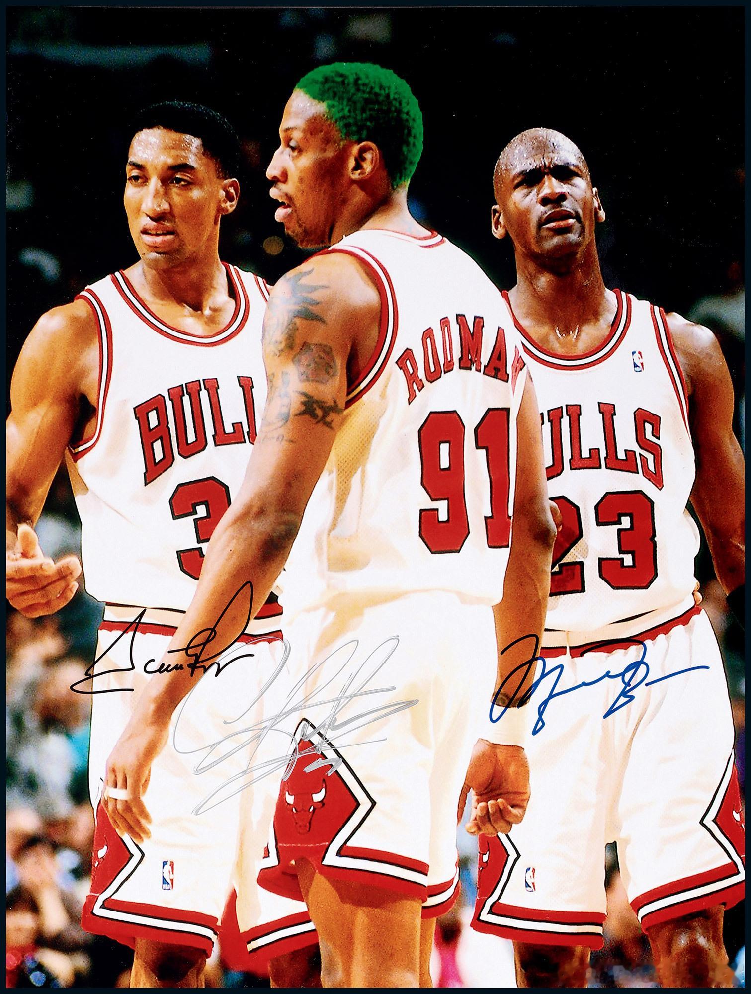 芝加哥公牛三巨头迈克尔·乔丹(Michael Jordan)、斯科蒂·皮蓬(Scottie Pippen)、丹尼斯·罗德曼(Dennis Rodman)三人联合亲笔签名照历史影像