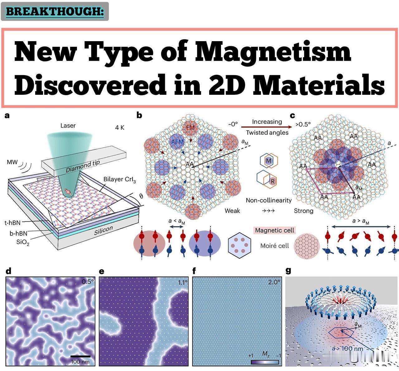 英国斯图加特大学的科学家们在二维材料碘化铬薄片中发现了一种新型磁性,这种现象被称为超莫尔磁性(super-moiré magnetism),并与纳米级的斯格明子(skyrmions)磁结构有关。这一突破性发现发表在《自然·纳米技术》(Nature Nanotechnology) 期刊上,对于未来的磁数据存储技术具有重要意义。 主要发现 新型磁性: 研究团队通过轻微扭曲两层碘化铬双层片(总共四层原子层),创造出一种新型磁性状态。与非扭曲双层片不同,扭曲后材料表现出净外部磁场。 斯格明子结构: 这种扭曲产生了纳米级的、拓扑保护的磁性结构,称为斯格明子。斯格明子是已知的最小、最稳定的信息载体之一,有望用于下一代数据存储技术。 超莫尔磁性: 实验观察到长程磁性织构(magnetic textures),其延伸范围超出了单个莫尔晶胞的长度尺度,这种状态被命名为超莫尔磁性状态。 可调控性: 这种新发现的磁性可以通过调整电子在单个层中的相互作用来实现选择性控制,并且对环境扰动具有鲁棒性。 研究方法 研究人员利用了一种基于金刚石氮空位(NV)中心的量子传感技术(量子钻石磁力计),成功地首次直接检测到了扭曲二维磁性材料中的斯格明子。这种高灵敏度的显微镜技术能够解决纳米级磁性图案的成像挑战。 该项目由斯图加特大学应用量子技术中心(ZAQuant)主任 Jörg Wrachtrup 教授领导,博士后研究员 Ruoming Peng 和博士研究员 King Cho Wong 共同进行了实验。 这篇题为《扭曲二维碘化铬中的超莫尔自旋织构》("Super-moiré spin textures in twisted two-dimensional chromium triiodide")的论文于2026年2月7日在线发表在著名科学期刊《自然·纳米技术》(Nature Nanotechnology)上。