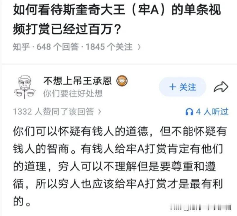 牢A当之无愧, 通过信息差就能赚钱赚到财富自由。 现在他的单条视频打赏已经破百万,试问那些网红大V们有几个能做到?所以说认知差、信息差真的具有很强的变现能力,网友们愿意为其买单。 现在全网最痛恨牢A的人是谁?毫无疑问是那些移民和留学中介了,本来就已经属于夕阳产业,现在更是直接断了他们的财路了。