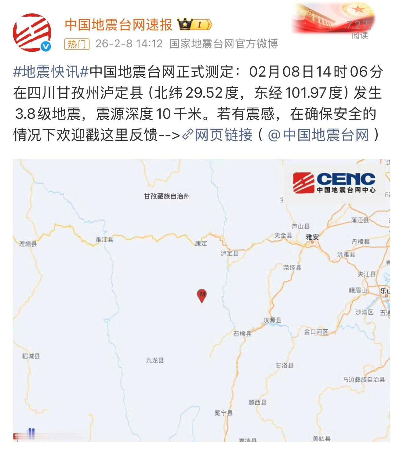 四川地震在老家一楼,完全没感觉到,3.8成都震感 应该不太明显,除非在高楼层。希望一切安好,四川人民似乎已经习惯了……你感觉到了吗?