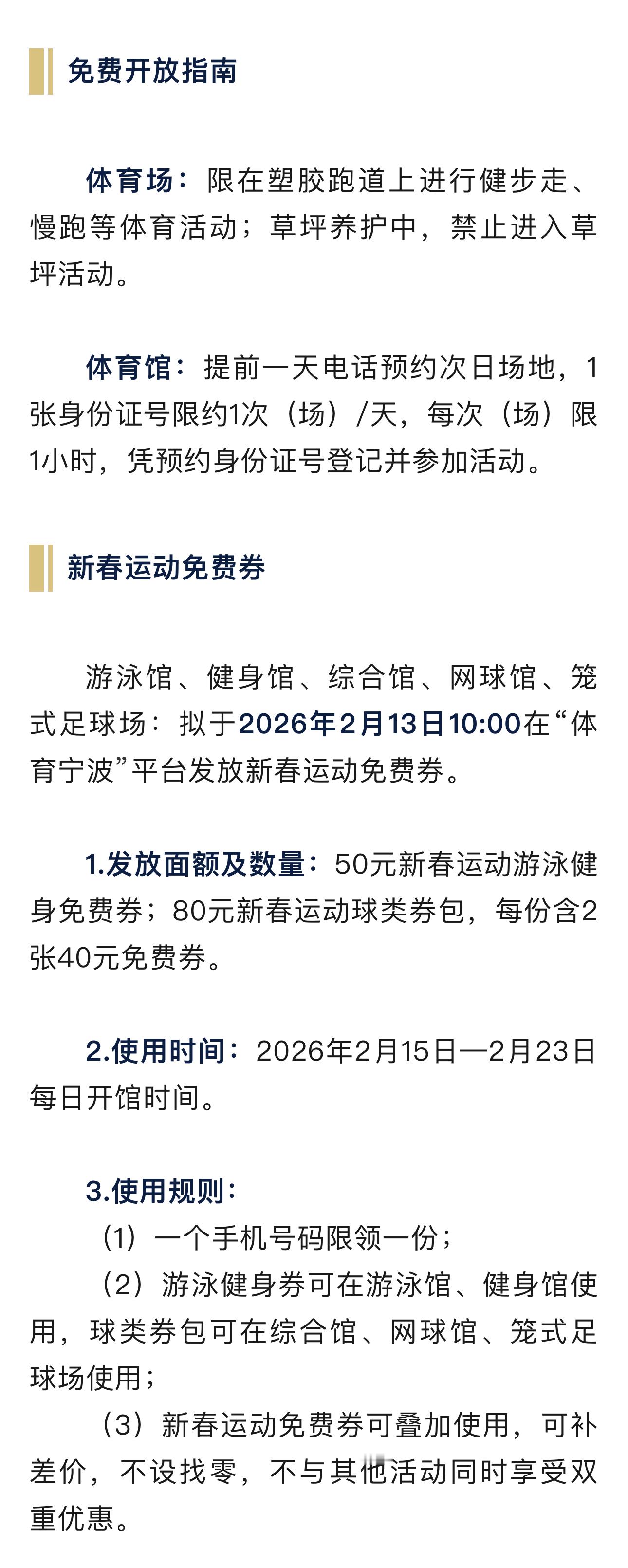 宁波部分免费体育场馆春节假期开放时间公布 宁波这些体育场馆,春节假期开放时间公布!2026年春节将近宁波市体育发展中心排定了假期场馆开放时间相关场馆除了定时开放之外还将发放新春运动免费券