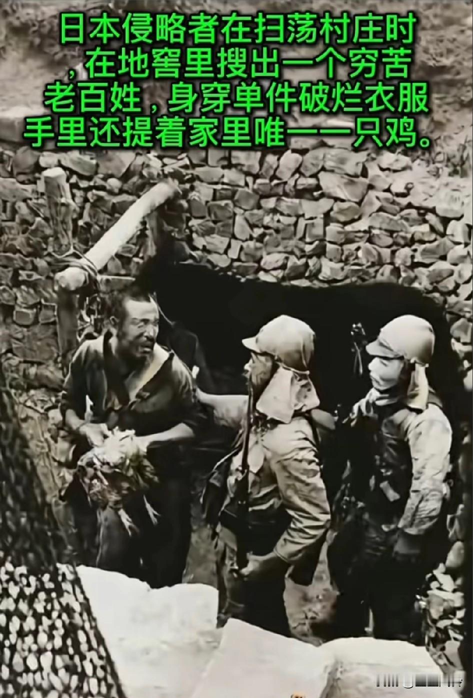 日本侵略者在扫荡村庄时,在地窖里搜出一个穷苦老百姓,身穿单件破烂衣服手里还提着家里唯一—只鸡。 从鬼子每次飞机轰炸总是从当地图书馆或档案室开始就知道,这帮畜生奔着取而代之来的。形容不出来什么词能够骂他们,任何一个词语都无法描绘它们的变态、残忍!日本人的今天是踩着我们先人的尸体过来的,日本人对我们中国先人的奸淫掳掠铁铮铮的事实,我们没有资格替先人原谅他们。