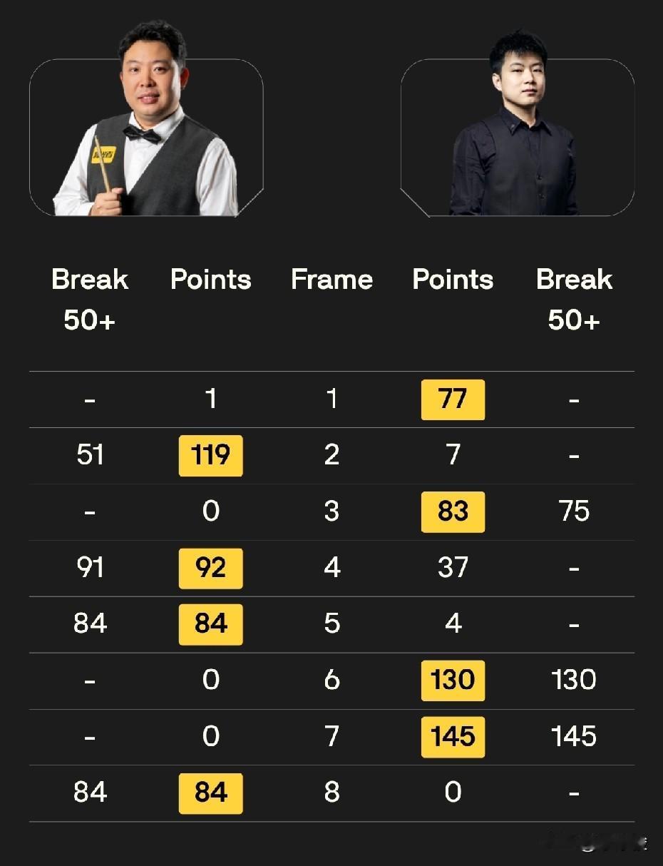 世界大奖赛决赛第一阶段,张安达4-4与赵心童战平。第二阶段19点开始。 张安达3-2领先,之后赵心童连赢两局,4-3反超,接着第8局张安达追平比分。其中第7局,赵心童一杆打出145分清台,成为目前本届赛事的单杆最高分。 不过,赵心童的准度有时变成一把双刃剑,风险很大,打进了,一杆致胜,打不进漏球,被对方一杆致胜。第8局,赵心童就是长台不进,留给张安达机会,张安达84-0超分获胜。 整场比赛赵心童虽然打出两杆破百、一杆50+,而张安达虽然没有破百杆,但打出4杆50+,也不弱。 看中国球员决赛,球迷轻松多了,但决赛两球员不轻松,张安达争排名赛第二冠,赵心童争第4冠。 关键是冠亚军奖金差太多,能拿18万英镑,谁愿意只拿8万英镑啊! 决赛第二阶段19点进行,估计比赛会更加激烈。
