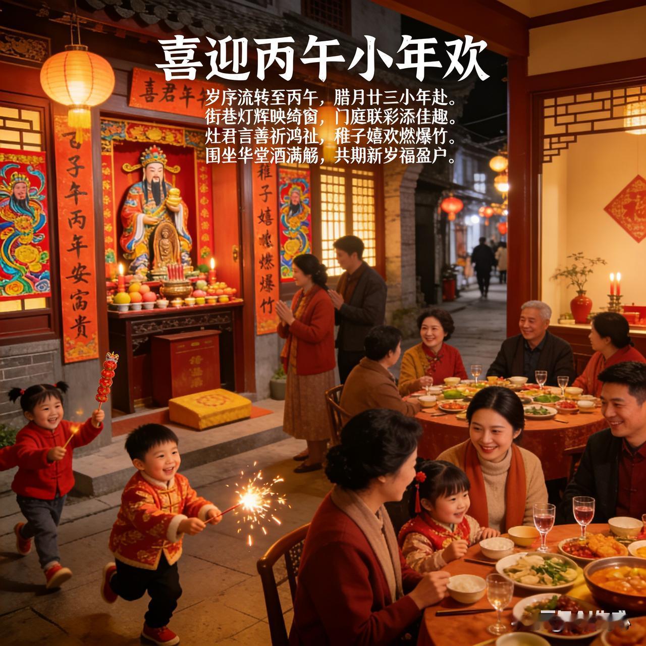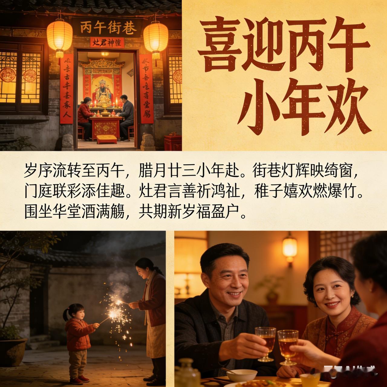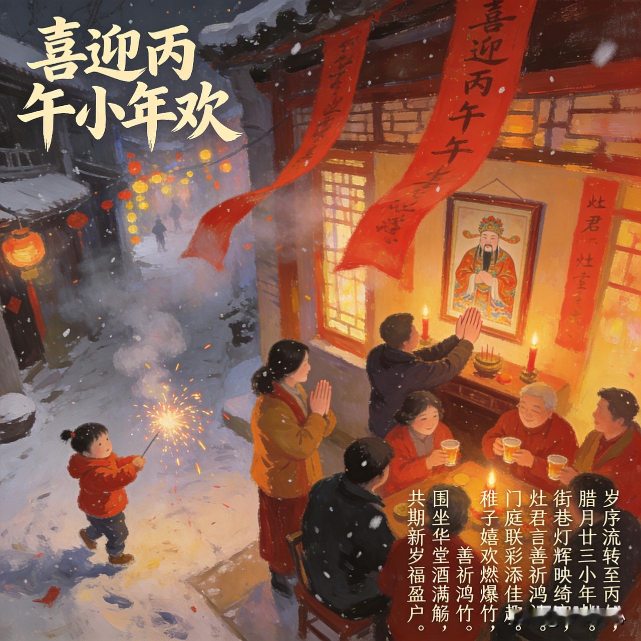 《喜迎丙午小年欢》乐韵诗心原创诗词: 岁序流转至丙午, 腊月廿三小年赴。 街巷灯辉映绮窗, 门庭联彩添佳趣。 灶君言善祈鸿祉, 稚子嬉欢燃爆竹。 围坐华堂酒满觞, 共期新岁福盈户。 这首诗词点明时间是丙午年(2026年)的腊月二十三小年。颔联描绘小年时街巷灯火辉煌,与装饰精美的窗户相互映衬,门庭上张贴的彩色对联增添了节日的趣味。颈联写人们期望灶王爷上天言好事,带来福气,孩子们欢快地燃放爆竹。尾联展现一家人围坐在华丽的堂屋中举杯畅饮,共同期待新的一年福气满满。