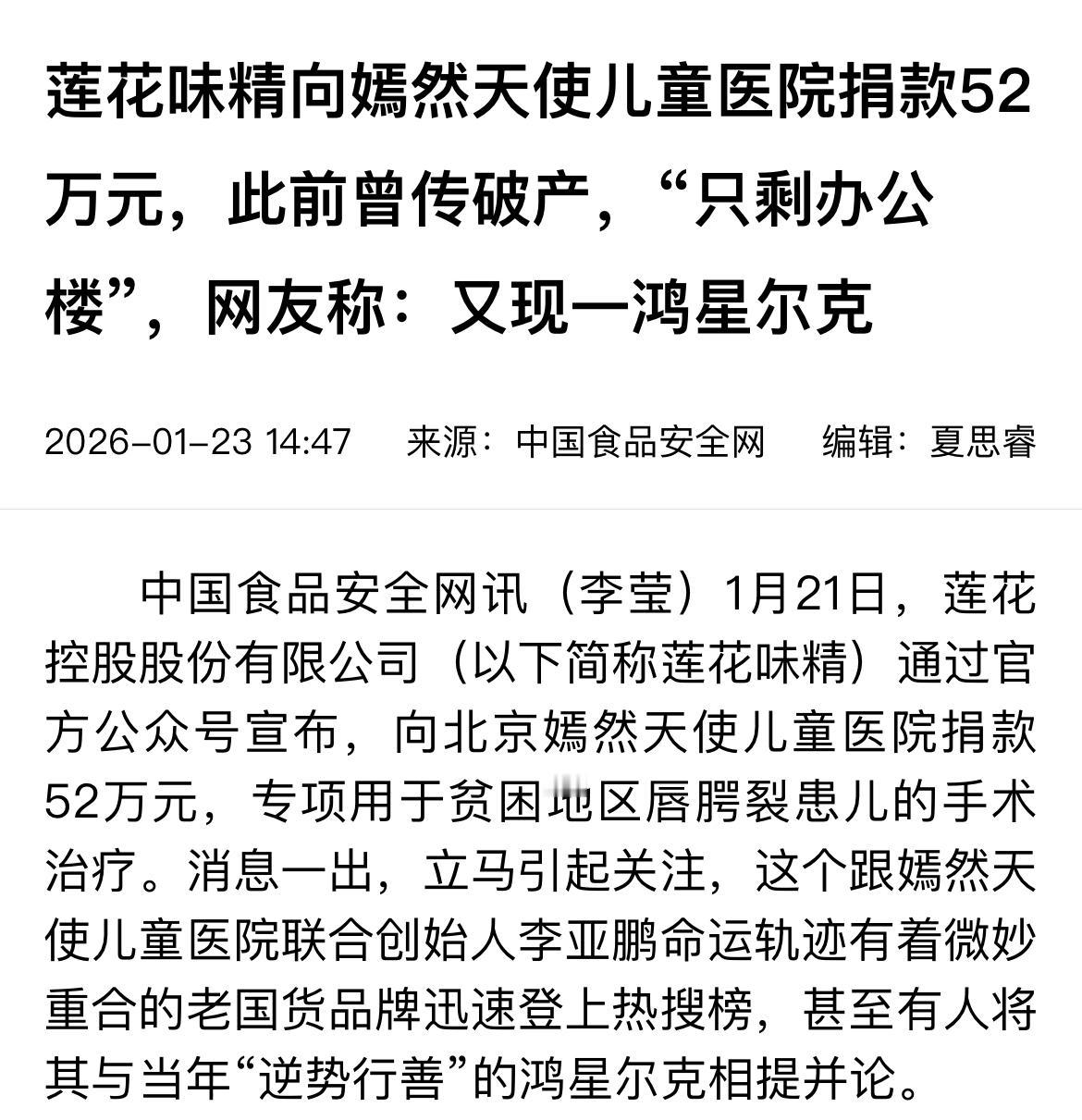 令狐冲行侠仗义走江湖,李亚鹏感恩的心再加播!李亚鹏说,今年的直播本来已结束,为感谢捐款支持嫣然天使基金的品牌加播一场! 李亚鹏为感谢卫龙、莲花味精、豪士面包、霞湖世家等多家品牌,今晚(8号)加播一场! 莲花味精1月21日为嫣然天使基金捐款52万元。 卫龙1月19日为嫣然天使基金捐款60万。 霞湖世家为嫣然天使基金先后捐款共计110万。 豪士面包1月18日为嫣然天使基金捐款30万。 消息一出,众人纷纷表示一定要去支持,不吃味精的网友甚至已经找到莲花味精的酱油作为平替。 相信今天晚上这些品牌产品一定会大卖!