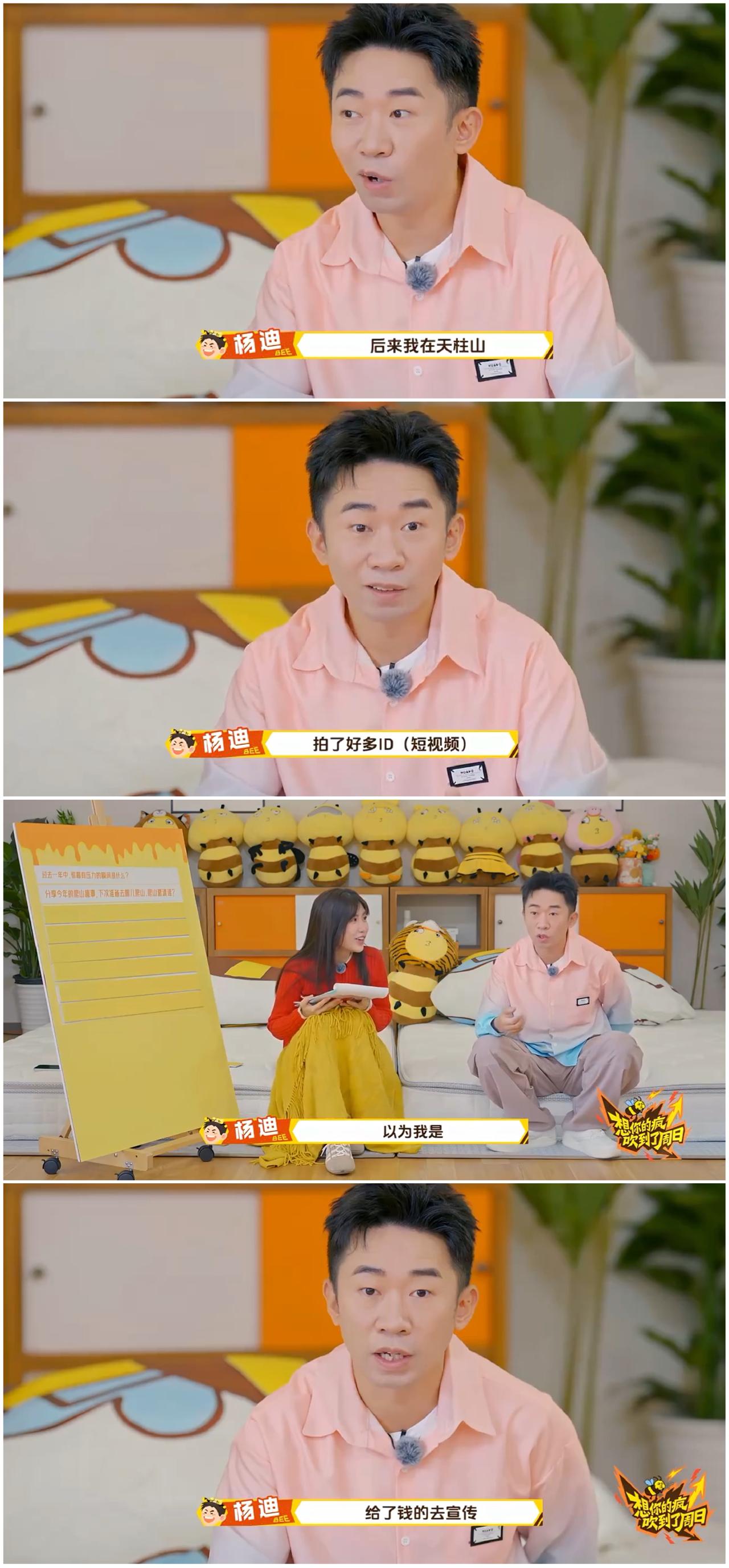 何炅也没有想到 自己不经意的行为 会给杨迪带来那么大的麻烦。 双十一之前, 何炅跟杨迪直播 突然想知道他下一座山要去哪玩。 杨迪毫无防备的说 要去安徽的天柱山。 结果天柱山的文旅 就迅速反应, 要求景区内的所有民宿和酒店 密切注意着一个月内 杨迪是否入住。 如果杨迪入住后, 立刻上报。 就这样杨迪到达天柱山后, 不得不拍了很多宣传天柱山的短视频, 不了解情况的人, 还以为杨迪拿了很多宣传费用。 杨迪强调自己没有拿到任何宣传费, 还要帮忙拍宣传视频。 不过也许他没有拿宣传费, 可能住宿和餐饮应该有免单或者打折吧 你说, 杨迪是否会抱怨何炅那样问, 暴露了行踪, 不然自己不会这样被天柱文旅抓着宣传了, 本来可以享受一下爬山的自由之旅的。 最怕有些网友去了天柱山有些不好的旅游体验, 就把这个账算在杨迪头上。