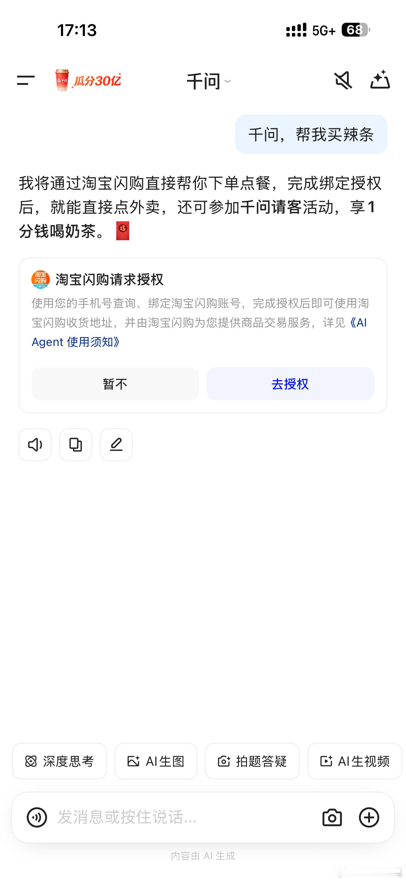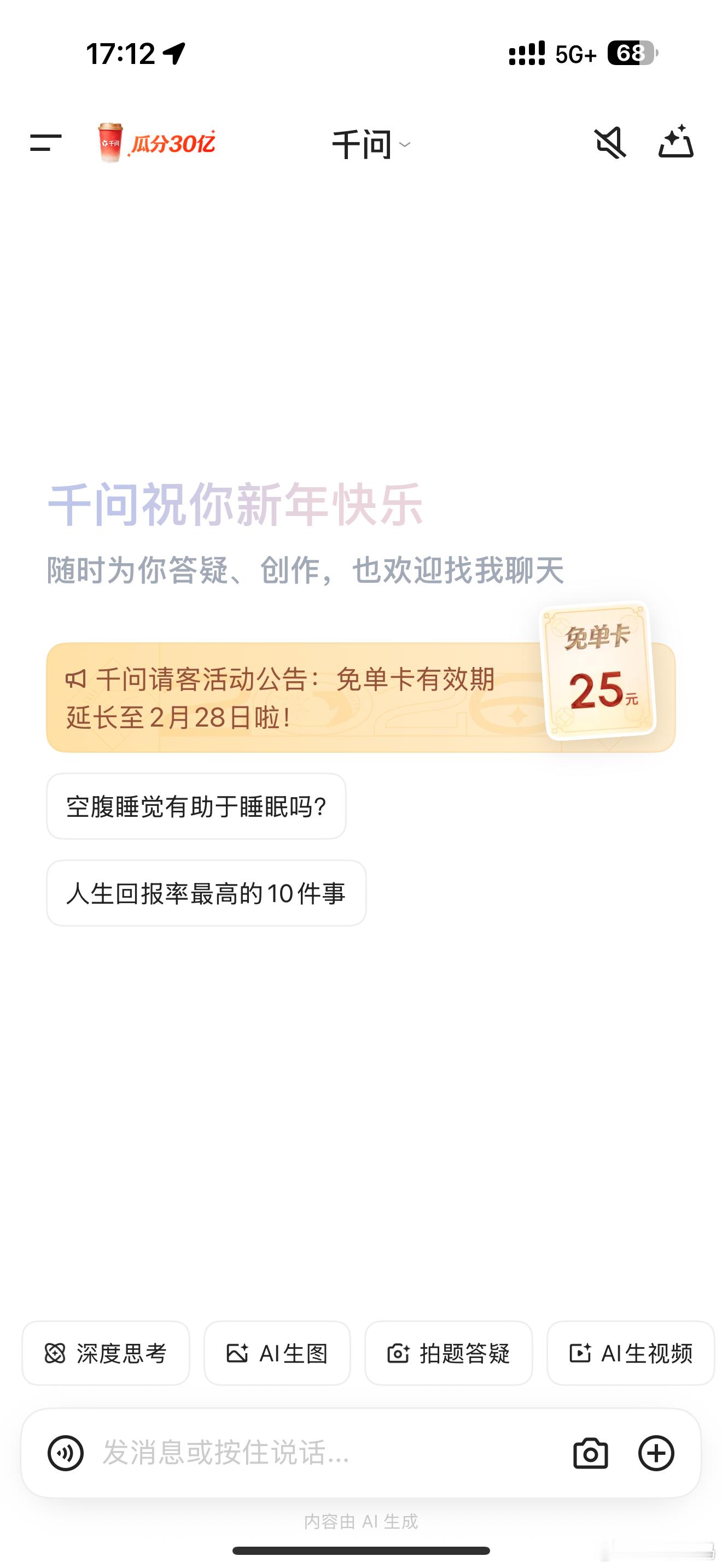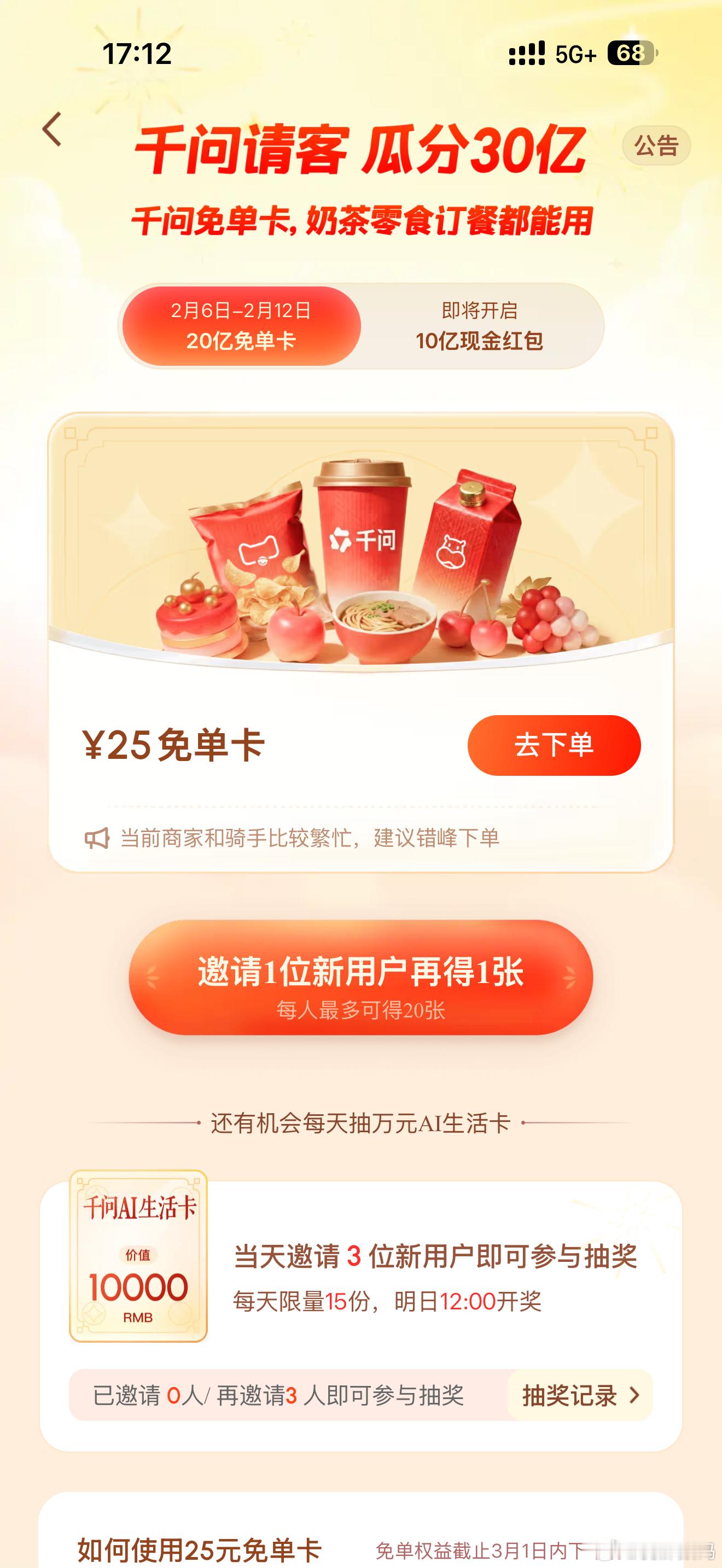 现在的AI都进化到能帮忙点外卖了?刷到何同学用千问给员工发福利,我也去千问凑了个热闹,居然真有免单卡(25块)。试着点了个外卖,连年货都能用,最后结账1分钱。怪不得他说AI请客,这顿饭确实香。平时点外卖多的可以去看看,能省一杯是一杯,不要白不要。何同学谢谢AI请客