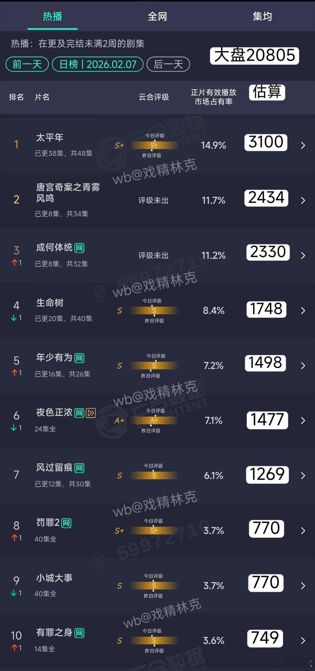 2.08云合:唐宫奇案12.7%成何体统11.8%生命树8.5%