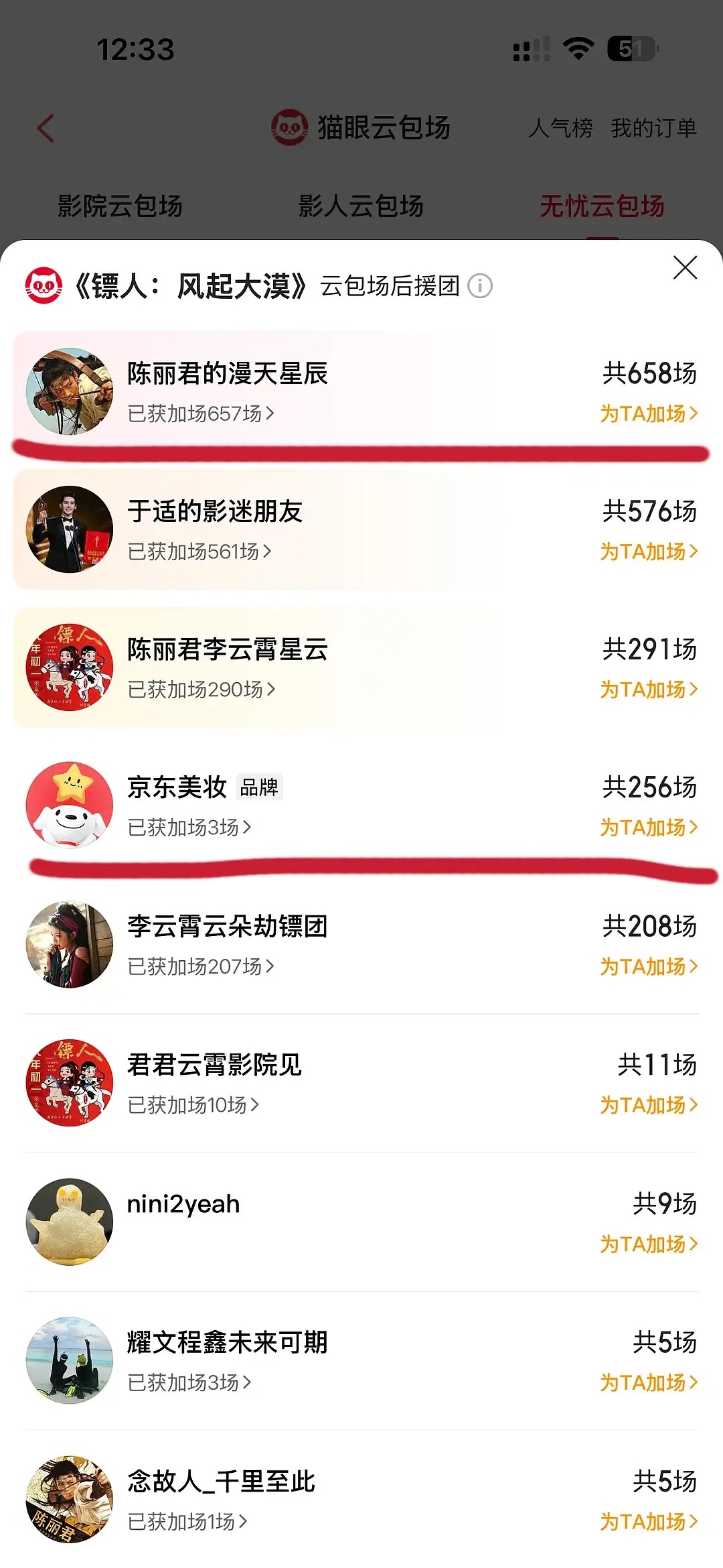镖人的包场,陈丽君遥遥领先啊。