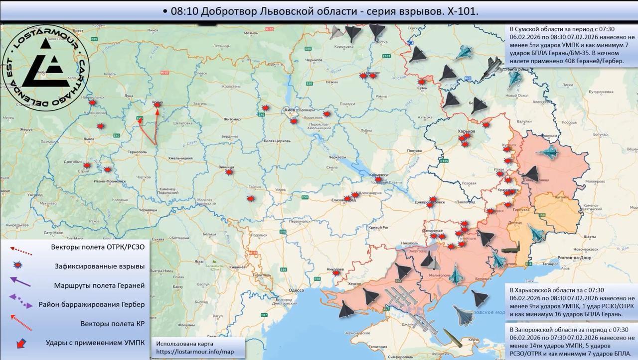 “炸!炸!炸”当地时间2026年2月7日,俄罗斯方面总结了从7月凌晨开始,俄军对乌克兰全境轰炸情况,从2月7日00:20开始,俄军开启对乌克兰大轰炸:俄军BM-35星链制导的闪电-1/2自杀式无人机,轰炸了乌克兰西部沃伦州新沃利尼夫斯克地区,引发爆炸;00:20,俄罗斯空天军苏-34轰炸机投下滑翔制导炸弹,轰炸扎波罗热州; 00:35,苏梅州科诺托普地区爆炸,俄军BM-35星链制导的闪电-1/2自杀式无人机轰炸;00:50,基辅州亚戈京爆炸,俄军赫兰-3自杀式无人机轰炸;01:05-03:40,切尔尼戈夫州巴赫马奇地区、切尔尼戈夫州巴赫马奇地区、哈尔科夫州梅雷法地区、切尔尼戈夫州巴赫马奇地区、哈尔科夫州、基洛夫格勒爆炸,俄军发射了伊朗小摩托,沙赫德-136自杀式无人机。 03:50,哈尔科夫州爆炸,俄罗斯空天军苏-34轰炸机投下滑翔制导炸弹,实施轰炸;04:20,沃尼纳州地区爆炸,俄军发射了伊朗小摩托,沙赫德-136自杀式无人机;04:59,伊万诺-弗兰科夫斯克州的布尔什丁地区爆炸,俄罗斯海军黑海舰队护卫舰发射的口径巡航导弹,爆炸声在布尔什丁热电厂响起;05:06,沃尼察附近爆炸,俄军发射了锆石高超音速巡航导弹;05:10,卢甘斯克地区爆炸,俄罗斯海军黑海舰队护卫舰发射口径巡航导弹;05:35-05:40,乌克兰基辅地区爆炸,俄军发射了伊朗小摩托,基辅750变电站区域;05:40-06:30,乌克兰伊万诺-弗兰科夫斯克地区的布尔斯廷爆炸,俄军发射了伊朗小摩托,袭击布尔斯廷热电厂。 07:00-07:55,卢甘斯克地区的多布罗特沃再次爆炸,伊万诺-弗兰科夫斯克州布尔斯廷爆炸,利沃夫州斯特里市周边爆炸,基辅周边爆炸,罗夫诺爆炸,俄军发射的伊朗小摩托轰炸了多布罗特沃热电厂;08:05-08:20,布尔什廷热电厂爆炸,乌克兰利沃夫州多布罗特沃地区爆炸,杜布诺和罗夫诺地区,俄罗斯空天军图-95MS、图-160战略轰炸机发射Kh-101巡航导弹实施轰炸。俄军这一轮打击主要是远程巡航导弹,远程自杀式无人机,使用俄军BM-35星链制导的闪电-1/2自杀式无人机开路,压制乌克兰军队远程空情预警雷达,炸开轰炸通道,44枚各种远程导弹砸向乌克兰西部,全部命中目标。不单单44枚远程导弹成功命中,俄军发射的410架自杀式无人机,大部分也全部命中目标,这意味着乌克兰空情预警体系,远程预警雷达全部被俄军炸崩了。